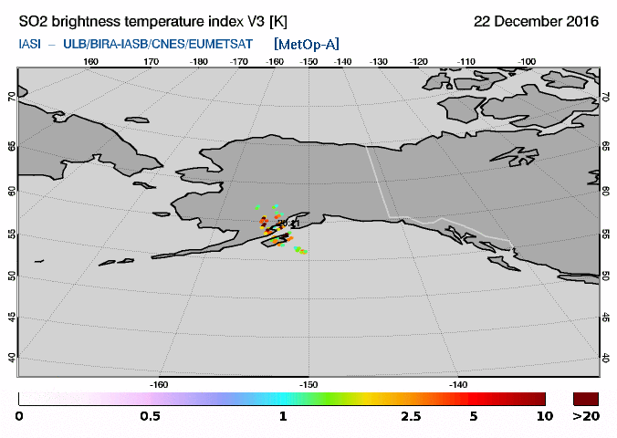Position of the dispersed sulfur dioxide cloud at 21:51 UTC (1:51 pm AST) from the eruption of Bogoslof volcano on December 21, 2016 (4:20 pm AST or 01:20 UTC on December 22). No ash was detected in the location of this cloud. Sulfur dioxide can typically be tracked for a longer time after an eruption as it is not removed from the atmosphere as quickly as volcanic ash. Image provided under the "The Support to Aviation Control Service (SACS)" project. http://sacs.aeronomie.be/