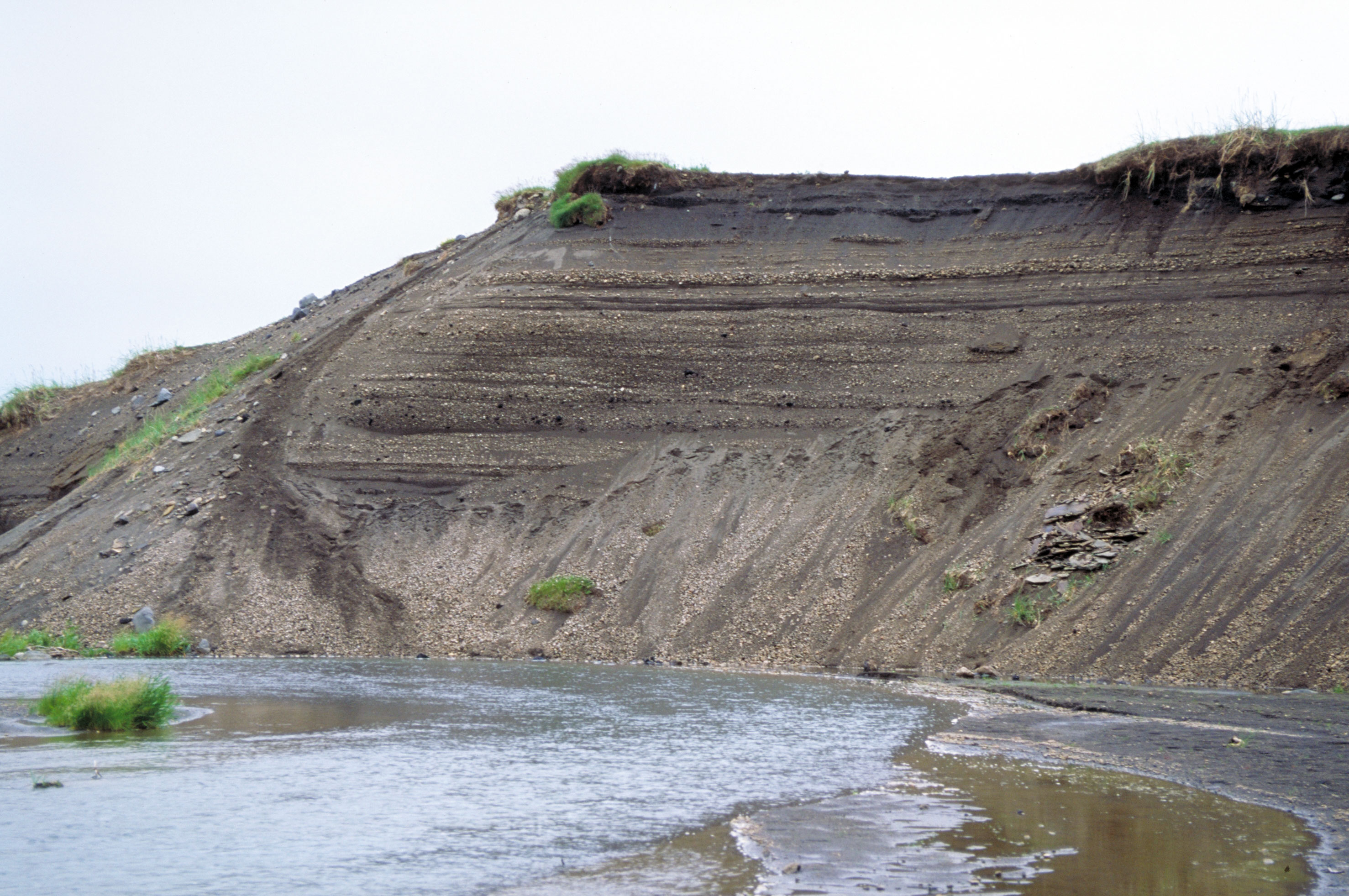 Cutbank along the lower Aniakchak River of fan flood deposits from catastrophic caldera outbreak flood. Location is near Mystery Creek.