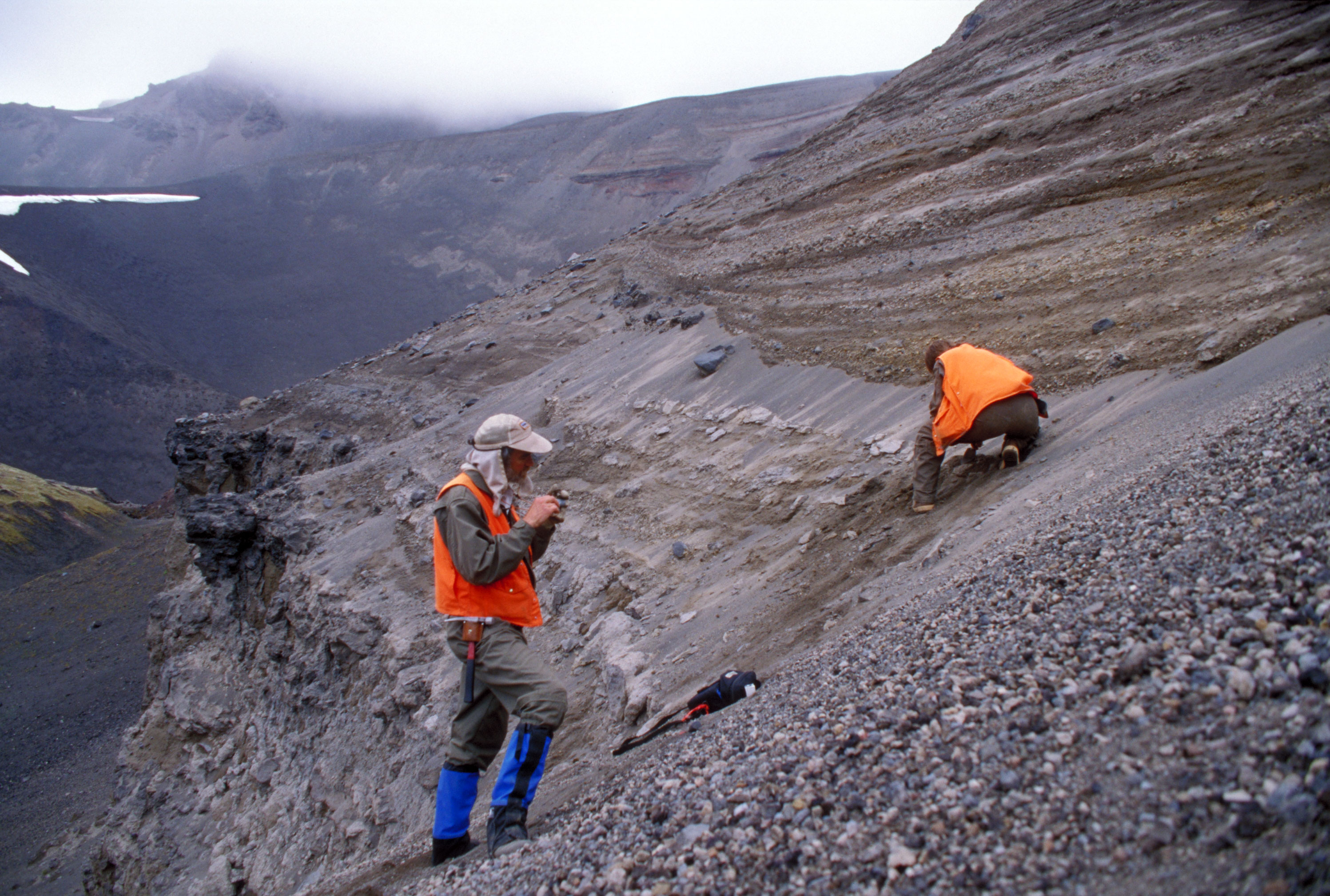 Geologists examining deposits. Location is west wall of 1931 crater. Aniakchak caldera.