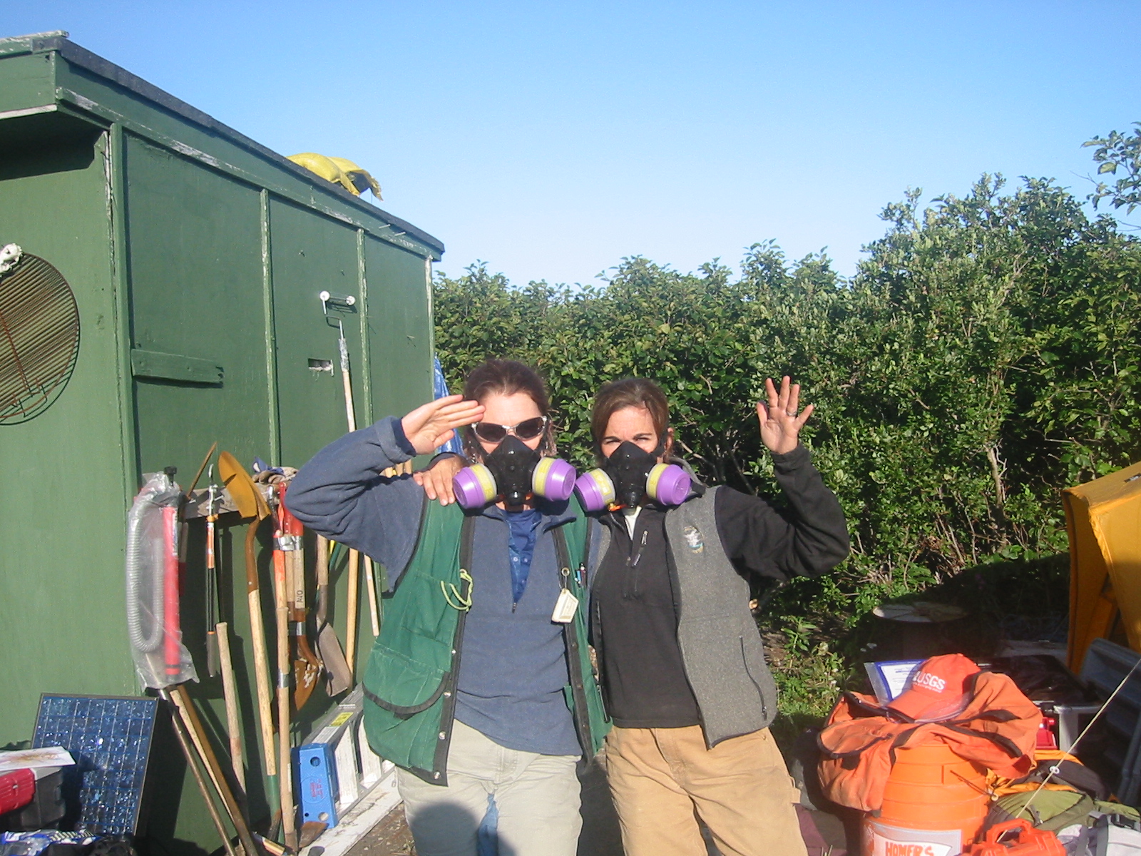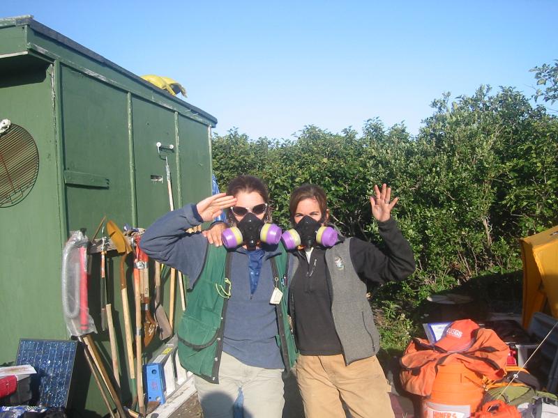AVO geologists Kate Bull and Kristi Wallace don gas masks in preparation for a day of work at the summit of Augustine.