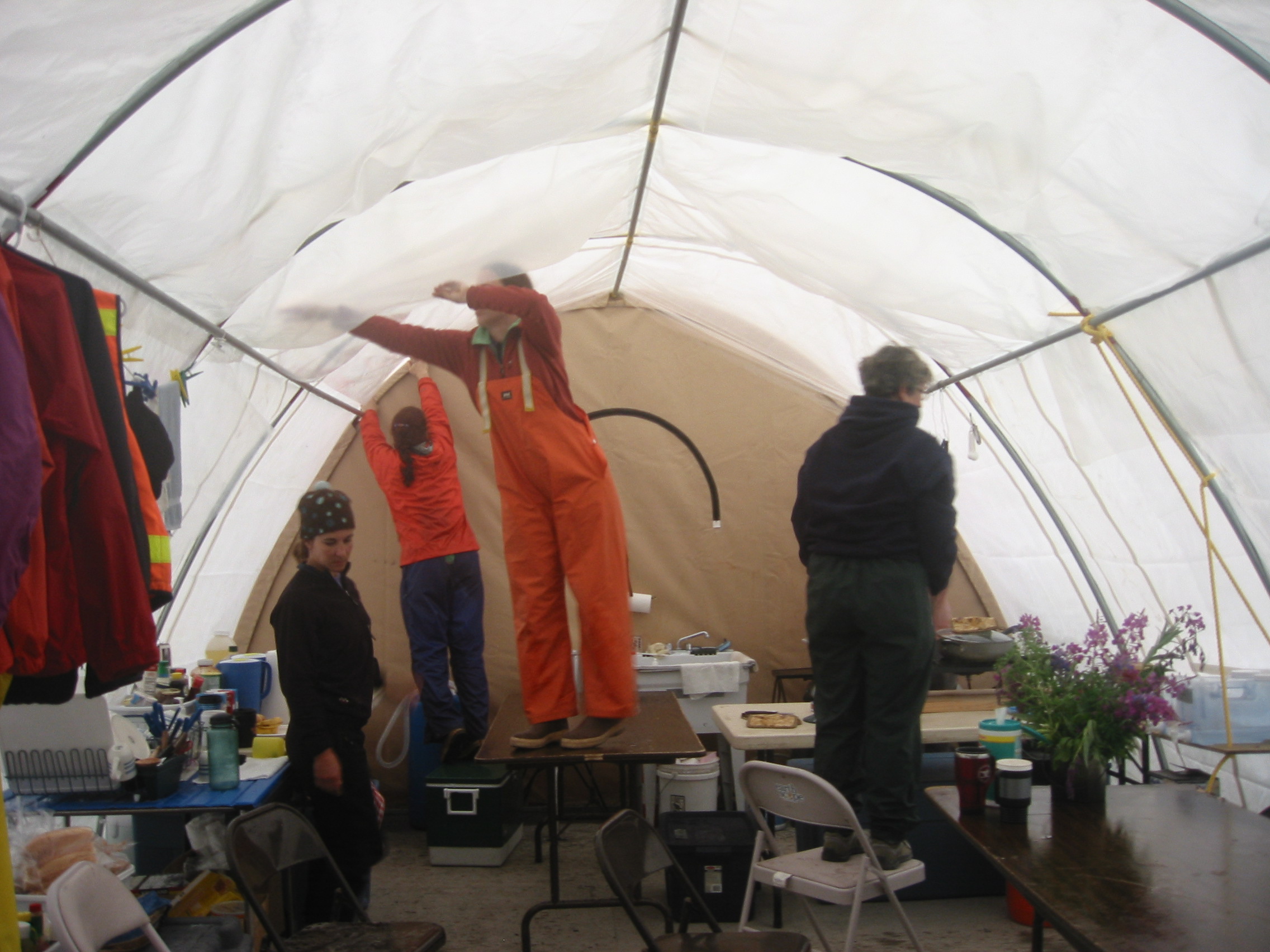During the first strong storm day at our camp, condensation on the interior of the weatherport required installation of a visquine barrier to catch the drips.