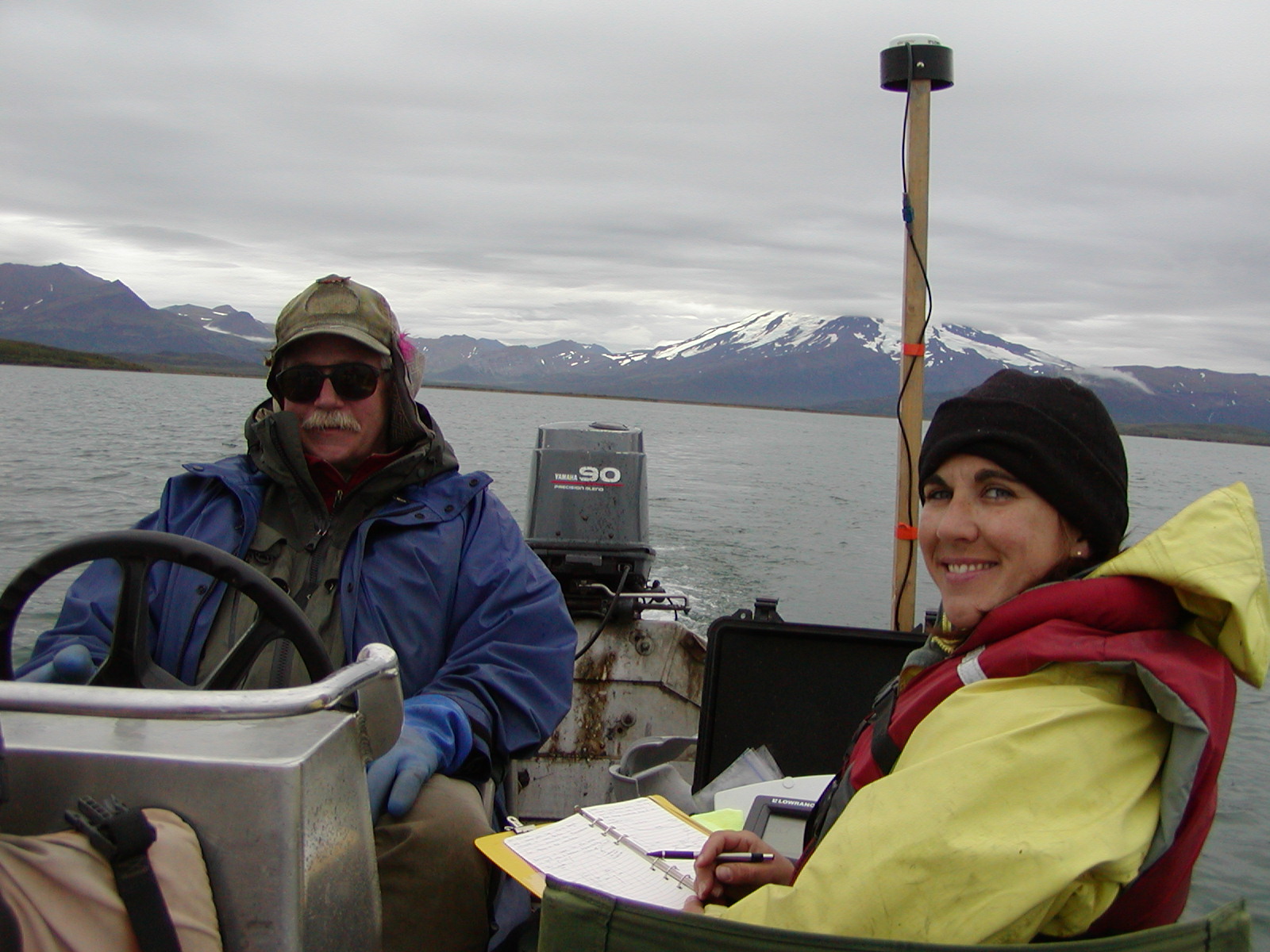 Painter Creek Lodge owner, Jon Kent, and USGS geologist, Kristi Wallace, conduct a bathymetric survey of Mother Goose Lake. The lower flanks of Chiginagak volcano can be seen in the background towards the southeast.