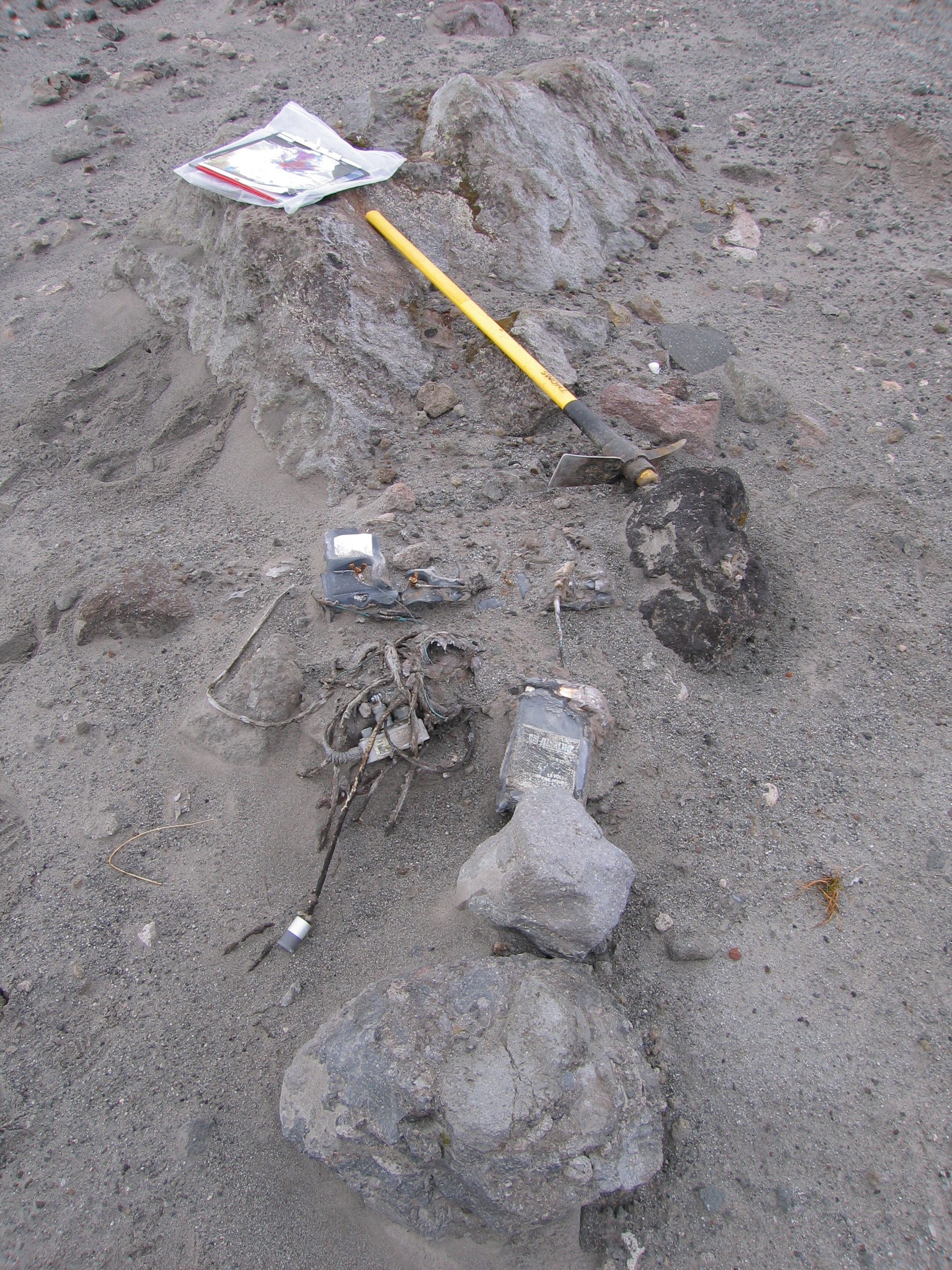 Remains of campaign broadband seismic site AU12, on NW flank of Augustine. This installation was damaged by a pyroclastic flow in late January, 2006, but the buried seismometer was retrieved in August 2006. The instrument itself was undamaged and contained data it had recorded up until its demise.