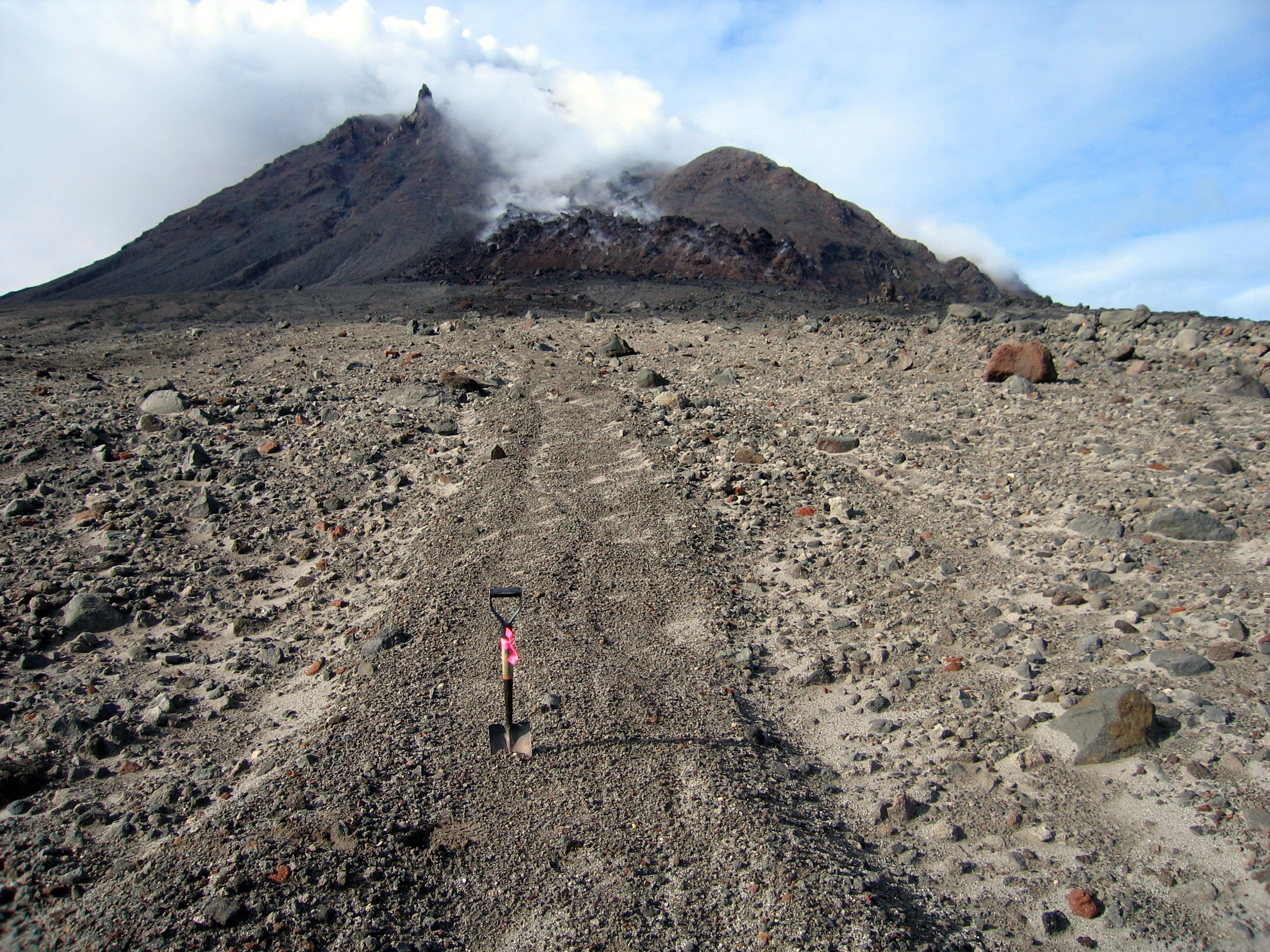 Small pyroclastic flow tongue in northeast fan on Augustine Volcano.