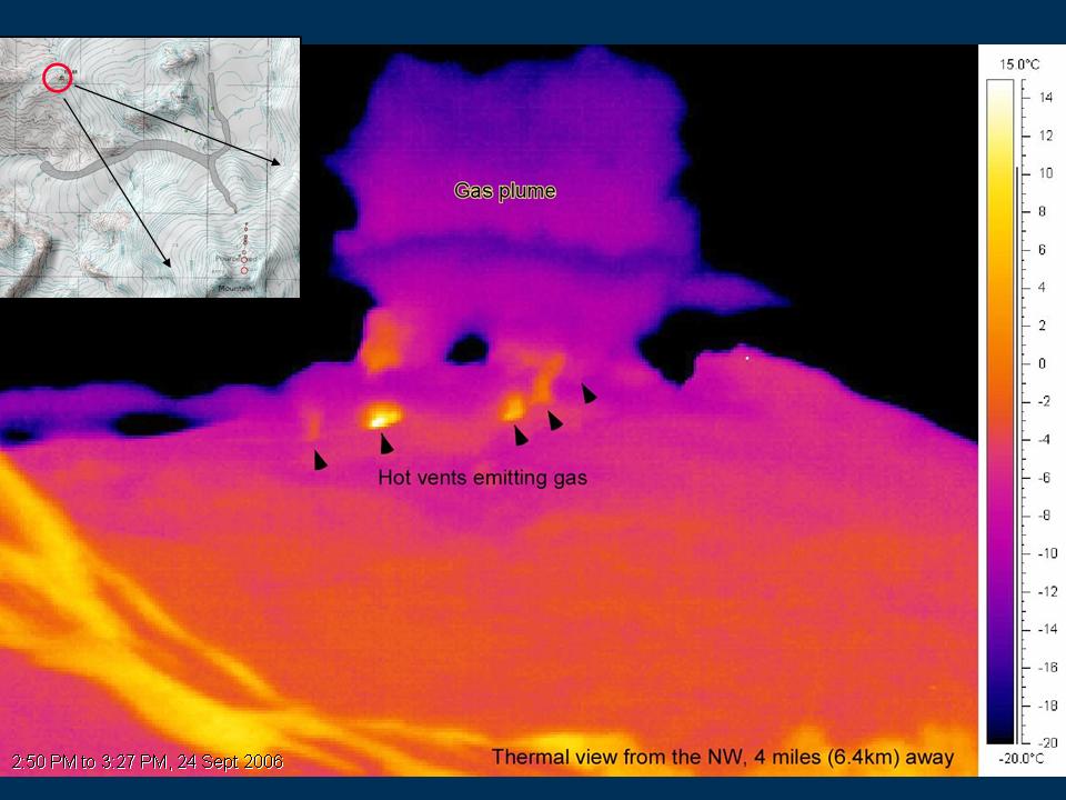 A shallow, degassing intrusion of fresh magma also would account for the ongoing gas emissions (K. McGee, USGS, oral commun., 2006). The lack of a seismic network at Fourpeaked precludes exact determination of the onset of seismicity that may have been associated with an intrusion. However, the swarm detected on the Katmai network on September 17 likely captured the most vigorous phase of the event, including the onset of phreatic eruption.