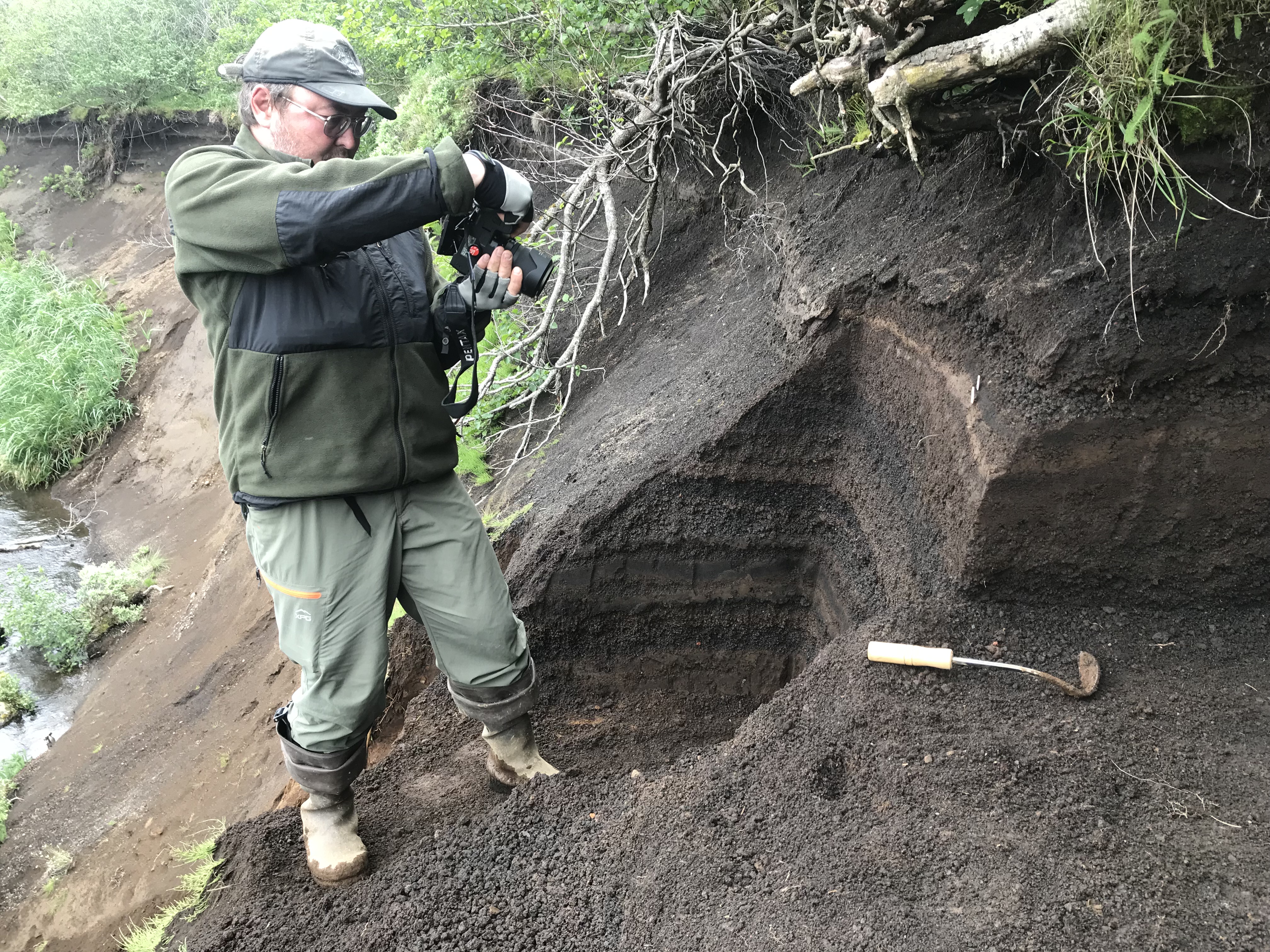 Pavel Izbekov photographs a section during tephrostratigraphic work at Pavlof Volcano, July 2018. This section (station 18IPE2) is located approximately 15 km northeast of Pavlof, close to the coast bordering Pavlof Bay.