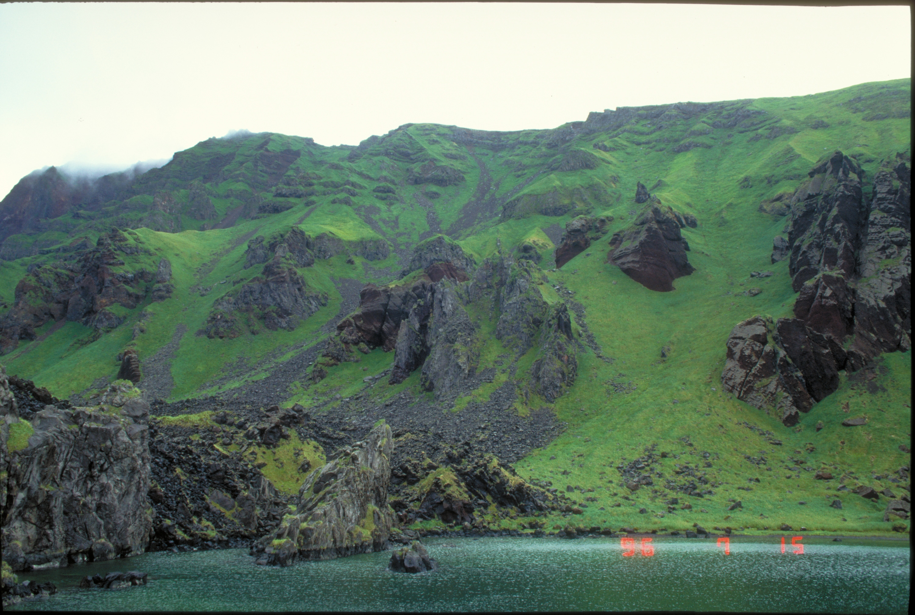 Cinder cone (cross section, center of view) exposed at Lava Bight, south end of Lava Point lava field, Akutan Volcano.
