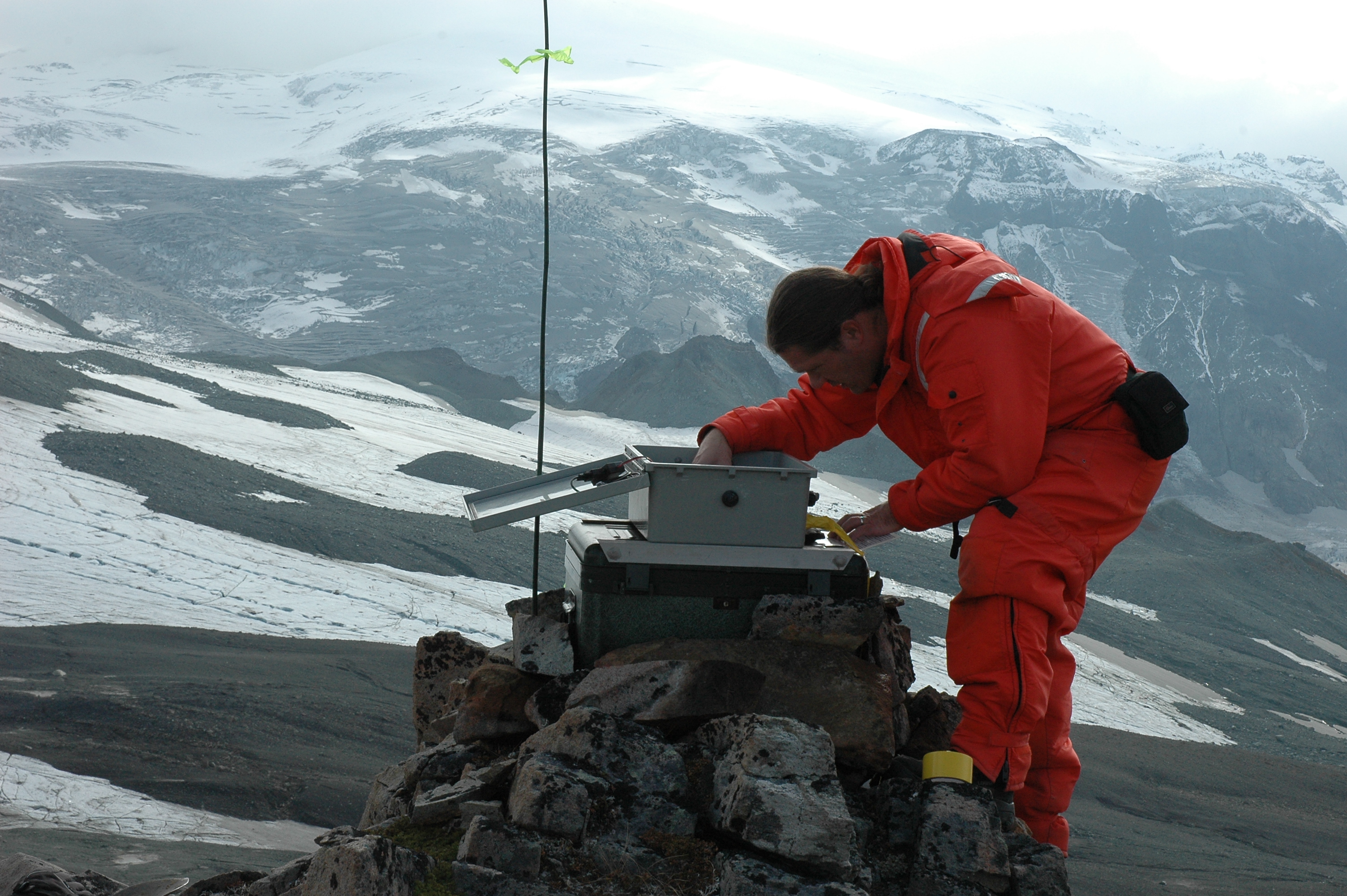 Photograph of AVO staff Rick Wessels installing time-lapse camera west of Fourpeaked volcano. The camera is looking E SE at the summit area of the volcano. On a clear day, the summit craters are in full view.