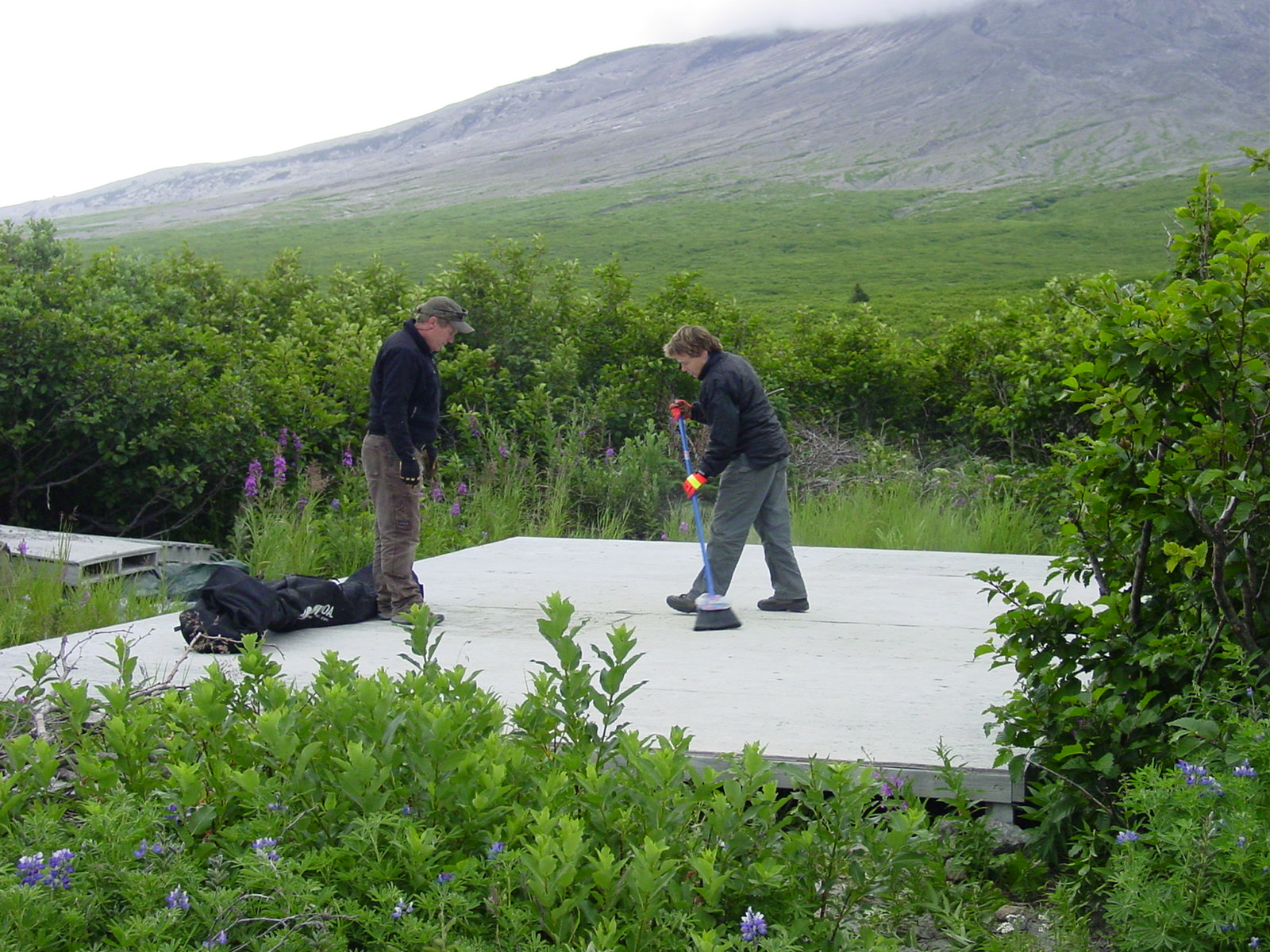 Augustine Field work, August, 2006. Tina Neal and Game McGimsey (AVO-USGS) sweeping off tent platform prior to erecting the kitchen tent.