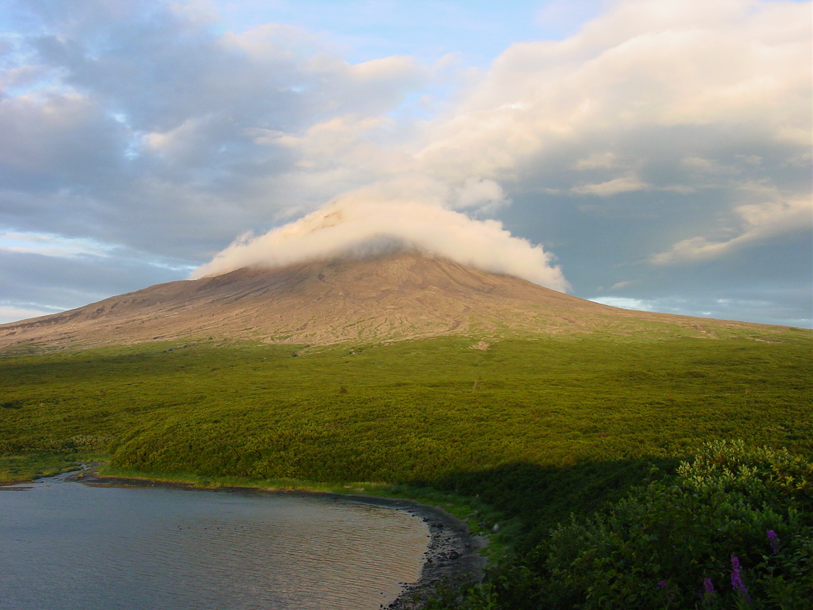 Augustine Field work, August, 2006. Summit clouds and plume in late setting sun, from camp.