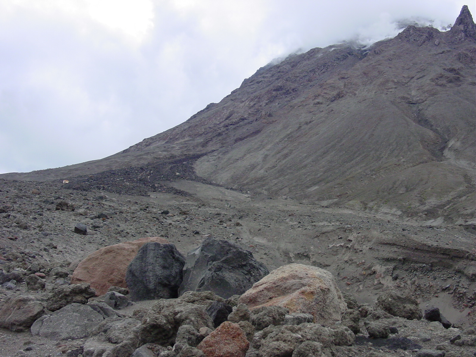 Augustine Field work, August, 2006. Block-and-ash flow (Aba; black lobes), East chute. The Pinnacles are in upper righthand corner of photo.