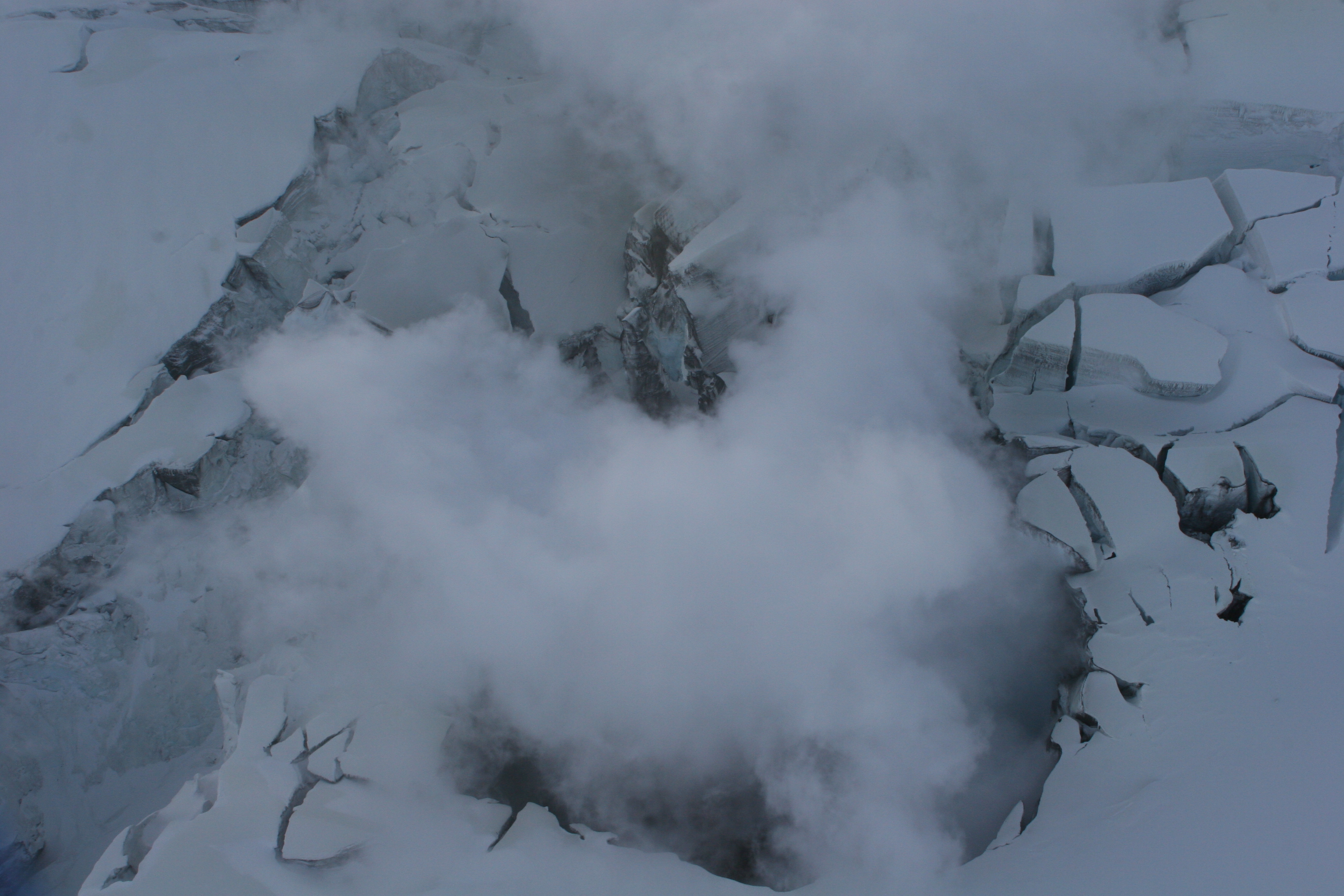"Steam plumes were visible in the web camera on February 8, 2009, and during gas measurement flights on June 6, 2009, and November 2, 2009; during the November overflight, no gas was detected (M. Doukas, U.S. Geological Survey, written commun., 2012). As the phreatic activity diminished, the melt holes begam filling with snow and fumarolic activity was observed only from a single vent.