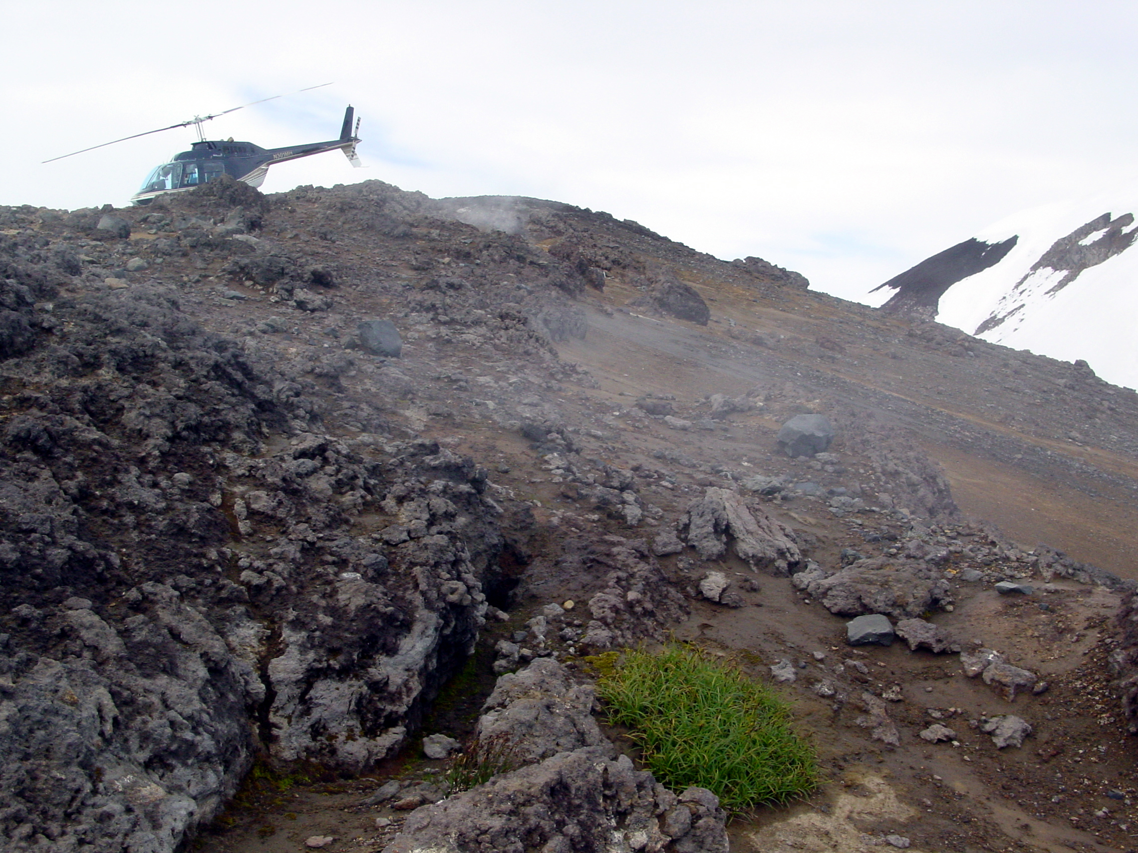 Area on the west shoulder of Konia where numerous small vents are emitting steam and possibly gas. Note steam to the right of helicopter tail.