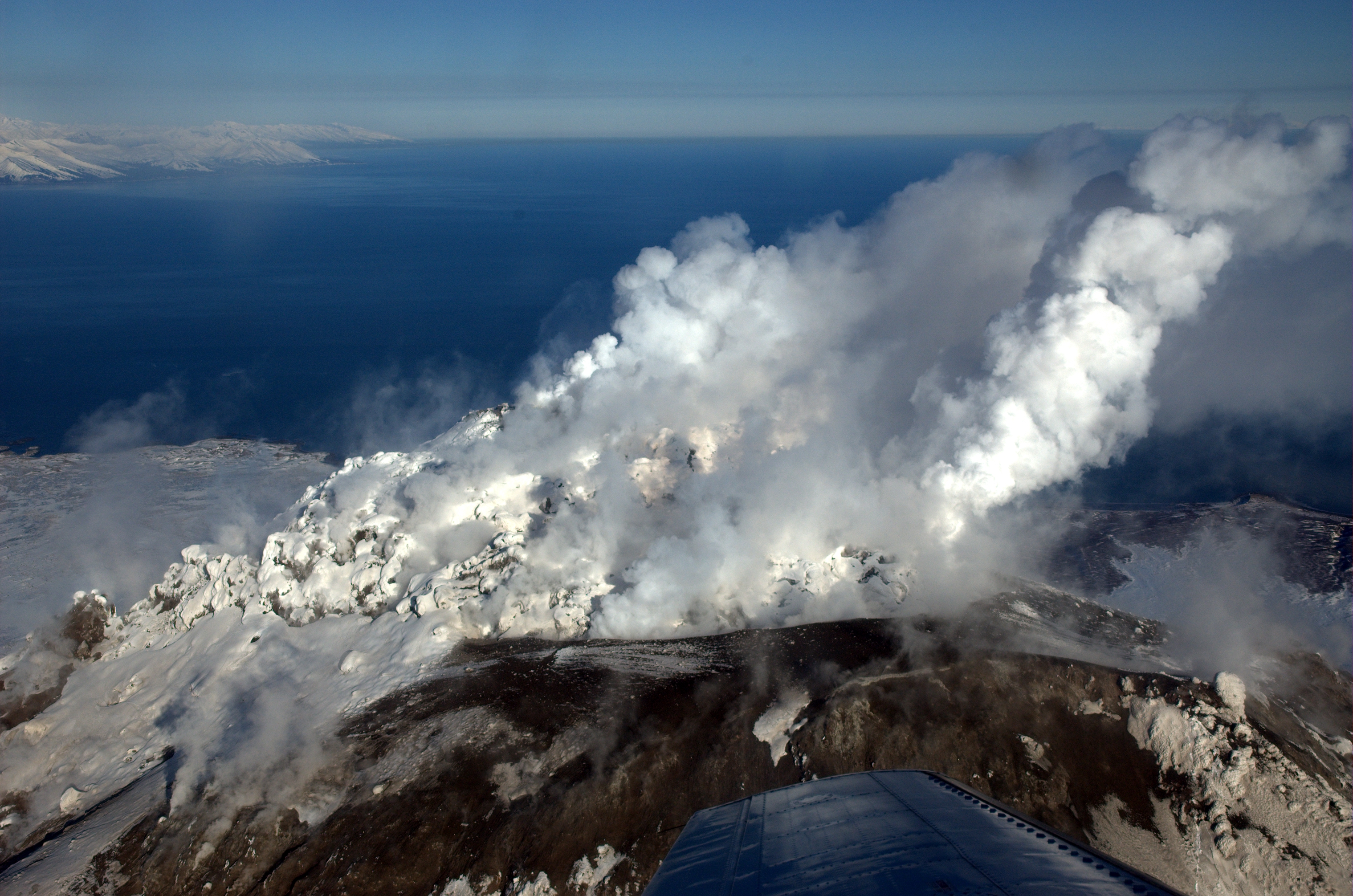 "Steam plumes were visible in the web camera on February 8, 2009, and during gas measurement flights on June 6, 2009, and November 2, 2009; during the November overflight, no gas was detected (M. Doukas, U.S. Geological Survey, written commun., 2012). As the phreatic activity diminished, the melt holes begam filling with snow and fumarolic activity was observed only from a single vent.