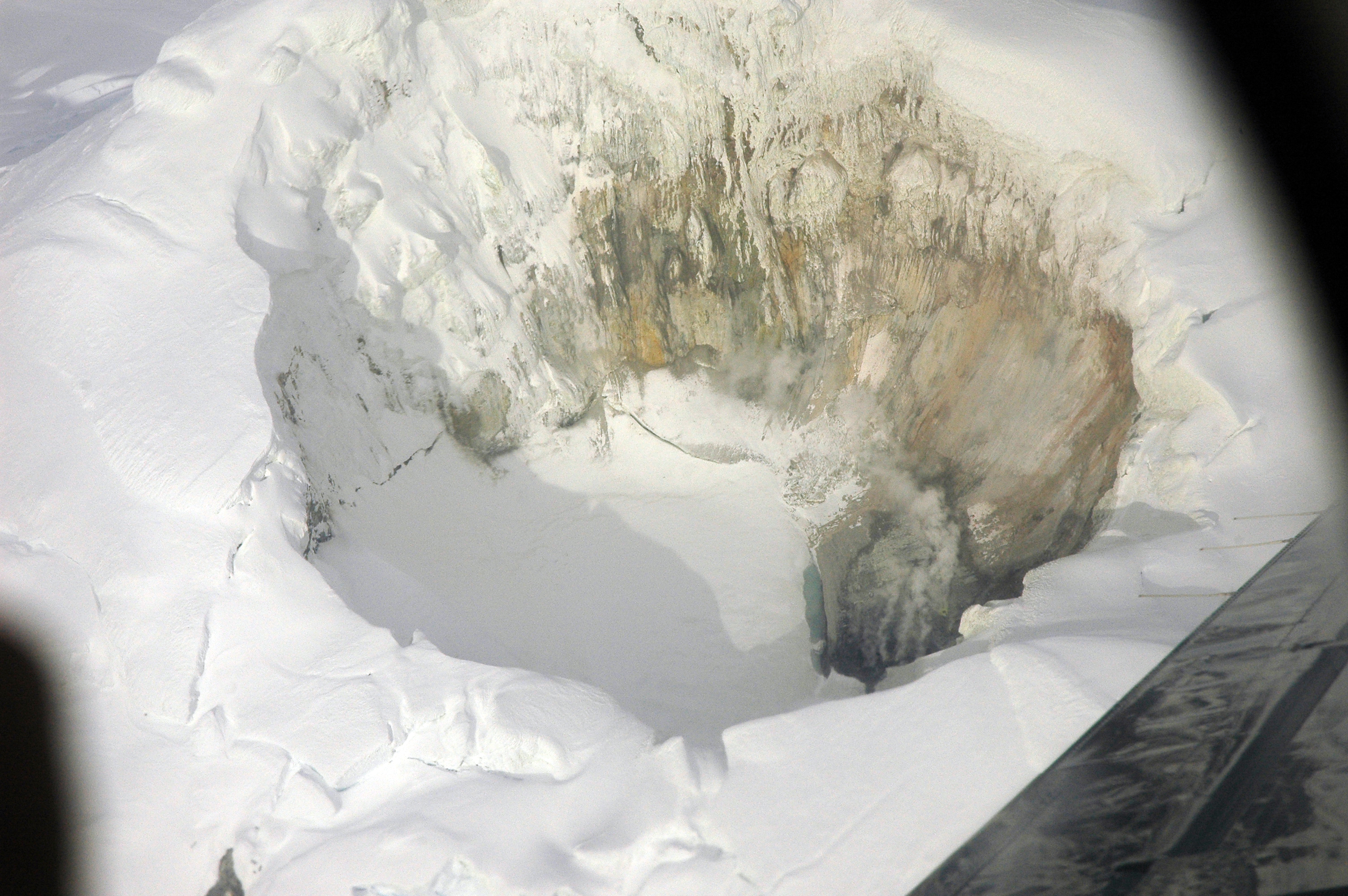 Summit ice cauldron of Mount Spurr. The lake is now mostly frozen and snow is accumulating, ramping up the southwest wall. A narrow strip of ice-free water exists along the northeast shore, adjacent to the still-very-active fumaroles.