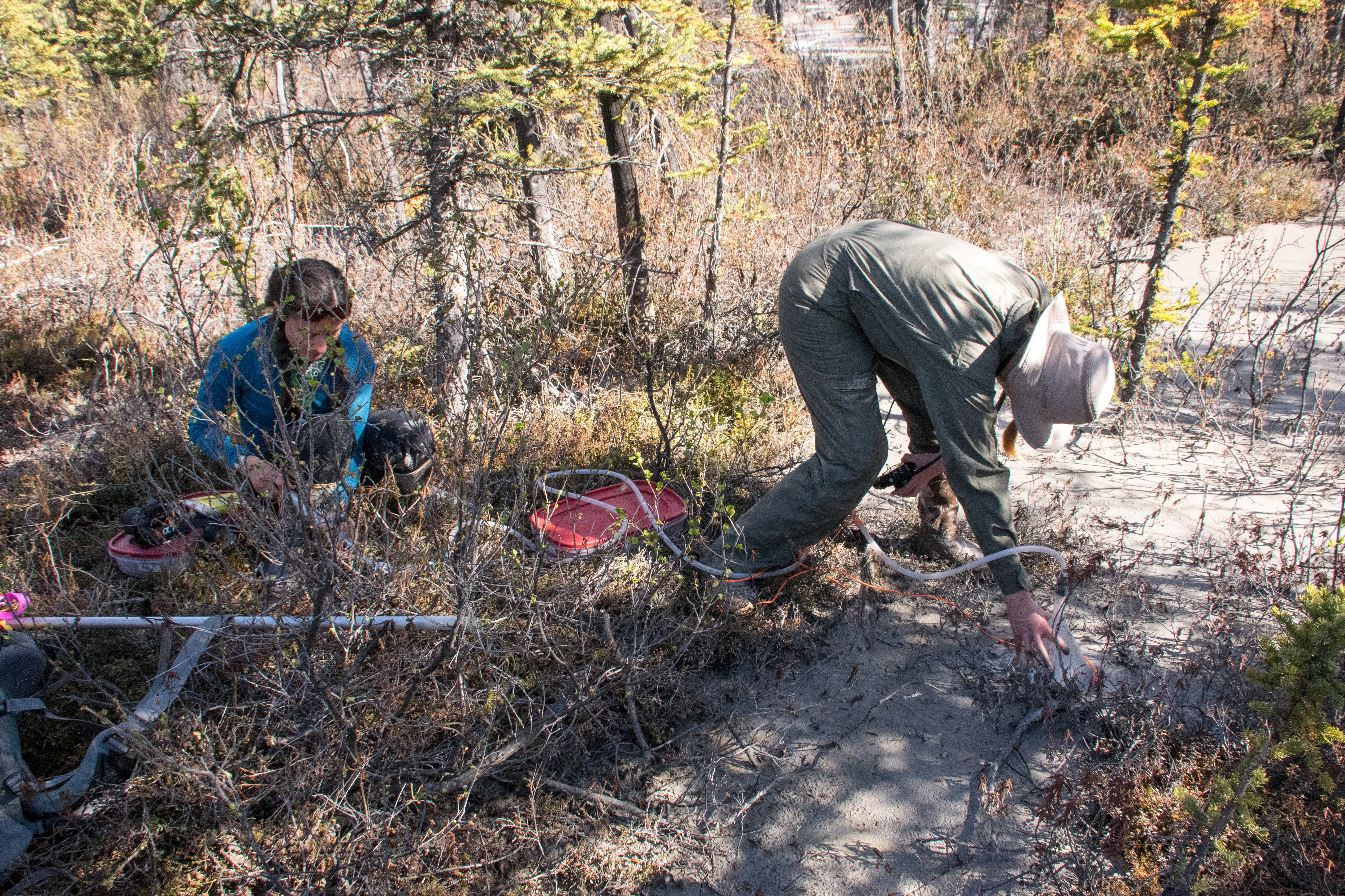Taryn Lopez (left) and Valerie Wasser (right) collecting gas samples from new vents at northern base of Shrub mud volcano.