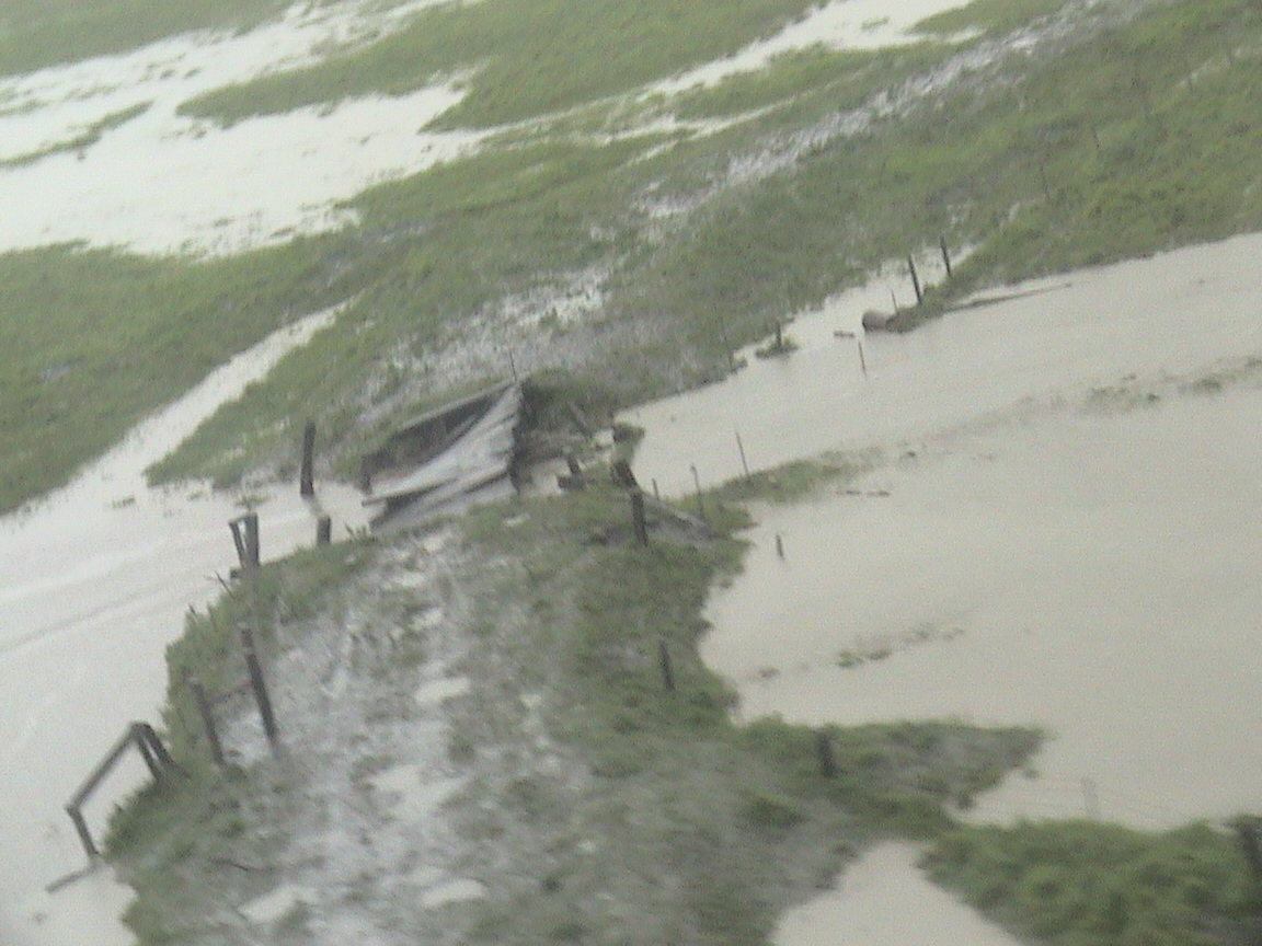 "Evacuated Fort Glenn ranch caretaker Lonnie Kennedy returned to the island on July 23 and, over the next several days, photographed eruption impacts and continuing ash emission and ash fall in the vicinity of the caldera. Kennedy documented ongoing muddy water flow across the lowlands surrounding the ranch; lahars in several drainages north of the ranch had been sufficiently energetic to destroy pre-existing wooden bridges and culverts and cause severe bank erosion. Dramatic new deltas had formed at the mouths of a number of creeks draining the northeast and southeast flanks of Okmok [fig. 17; imageid 15446]. The exact timing of lahar activity during the first days of the Okmok eruption is uncertain. It is also not clear if lahar formation was due to rain-remobilization of tephra, syn-eruptive condensation of water vapor entrained in the eruption cloud (W. Scott, USGS, written commun., 2008), dewatering of wet tephra fall, melting of snowpack, or some combination of these or other processes. Overbank deposits and the presence of large boulders atop the surface of the 2008 lahar fan at the mouth of Crater Creek (Crater Creek drains the caldera northwestward into the Bering Sea) suggest temporarily high discharge rates possibly caused by a sudden release of water from the caldera early in the eruption.