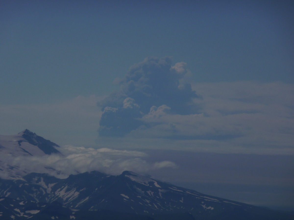 Aerial view of Okmok eruption. Photograph taken by Shawn Dahle, National Oceanic and Atmospheric Administration, National Marine Mammal Lab.