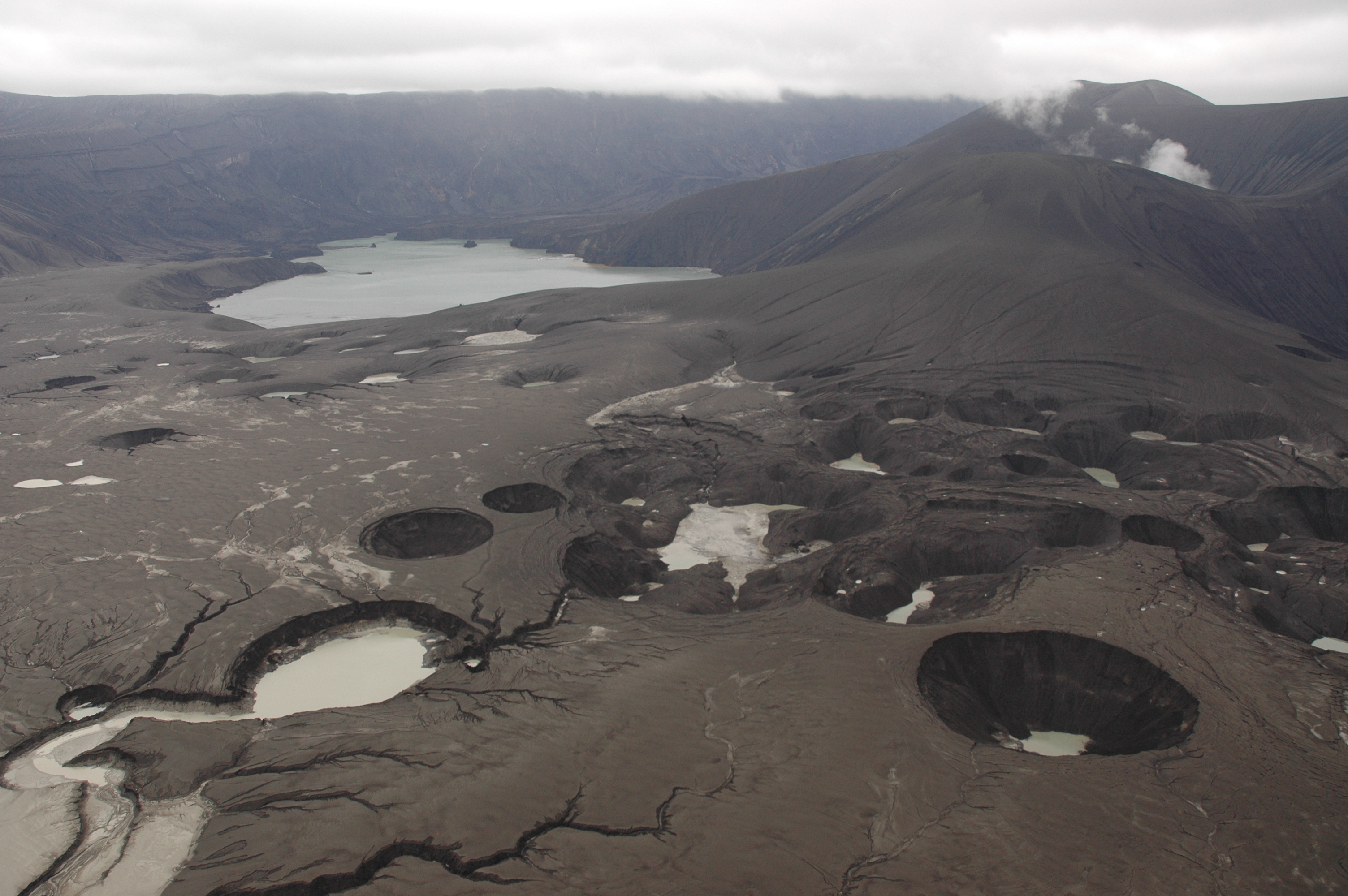 "Subsequently, over the first 2 weeks of August, eruption intensity and cloud height generally decreased and ash emission ceased altogether by August 19. A USGS helicopter crew working in the Aleutians entered the caldera on August 13 during the waning phase of eruption and photographed a single active vent enclosed within a steep-sided tephra cone [figs. 21; imageid 15120 and 22; imageid 15119]. Dark ash boiled out of the tephra cone surrounded by a collar of white water vapor; winds were from the northwest sending the ash and water vapor cloud over the summit of Cone D and the caldera rim. A significant lake was now present near the site of the pre-eruption lake and the landscape was completely covered with dark gray ash. The surface north of Cone D was pocked with craters several meters to several tens of meters in diameter. A series of scallop-margined basins and coalesced craters, some hosting standing water, extended in a line west of Cone D.