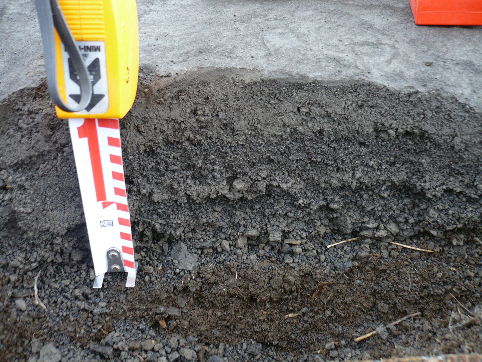 Tephra site 08JFLOK040 low elevation on the east flank not far from the base of Cape Idak and close to the axis of the July 12 plume. Prominent coarse ash and lapilli layers at base are July 12 fall units. The lower coarse lapilli fall unit generally fines upward, is capped by a muddy fine ash, and then the upper July 12 fall is a coarse ash here. Clasts are as large as 2 cm in the basal unit and 1 cm in the upper unit. We measured max clast dimensions here and I took a 10x10 cm area sample to help with volume estimates.
