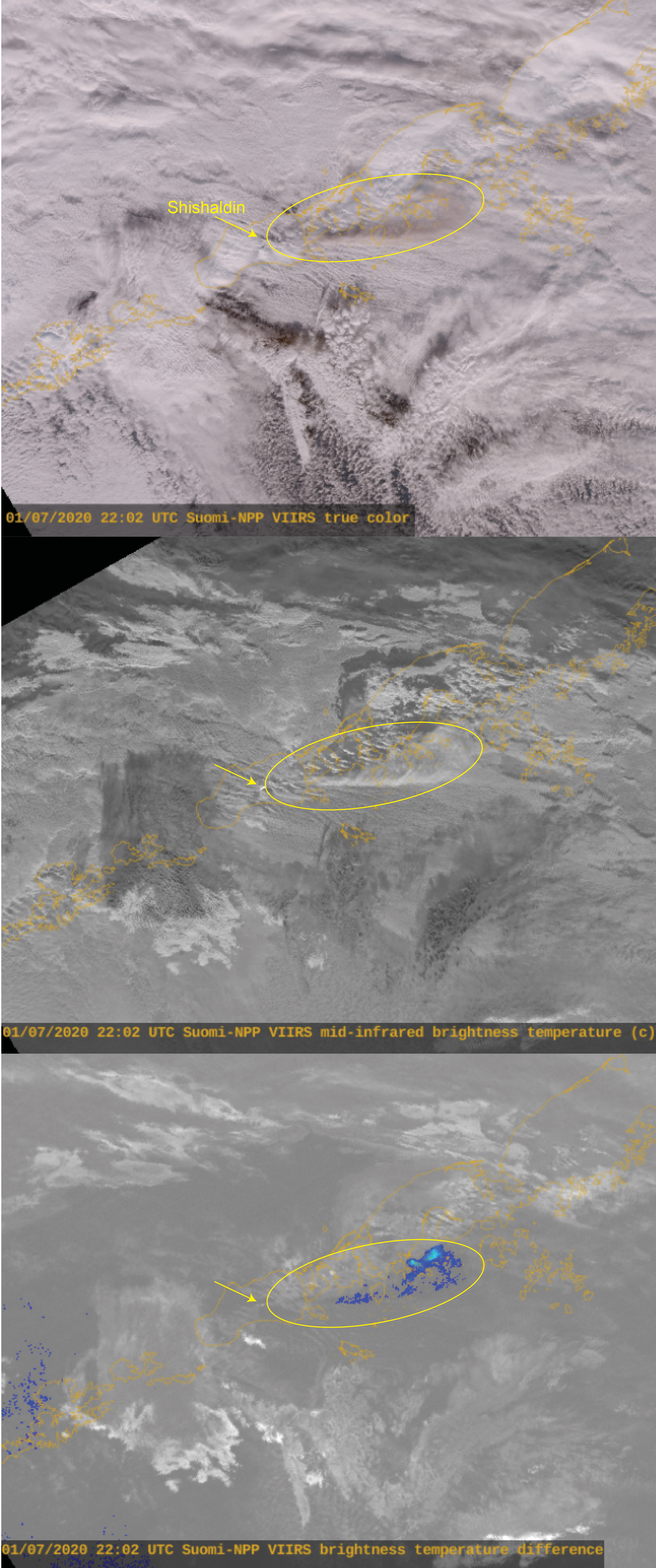 Shishaldin ash plume in visible, mid-infrared, and brightness temperature difference satellite images (Suomi-NPP VIIRS).