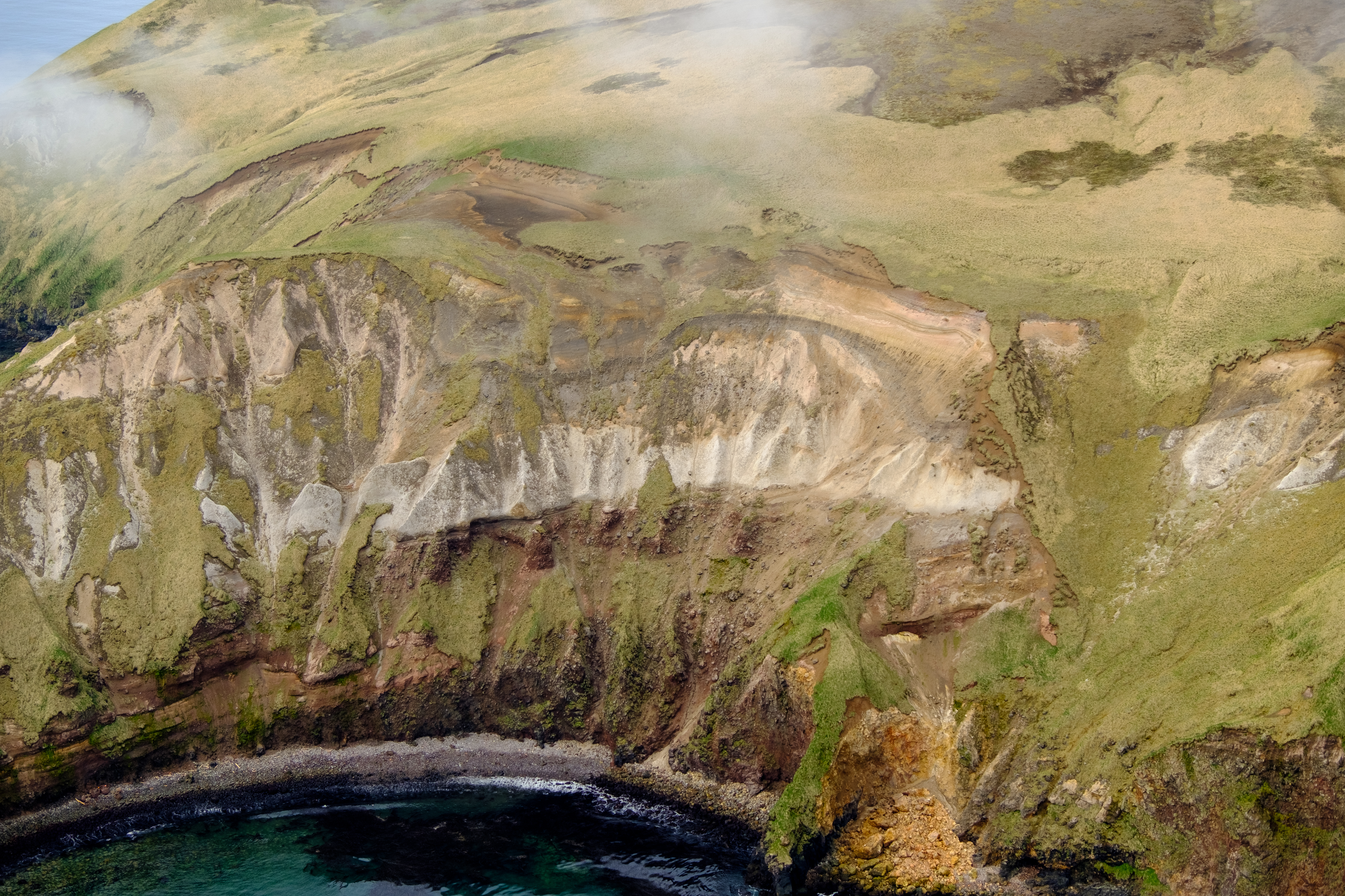 Lava, debris, and pyroclastic flows along with airfall tephra deposits on NE Davidof Island.