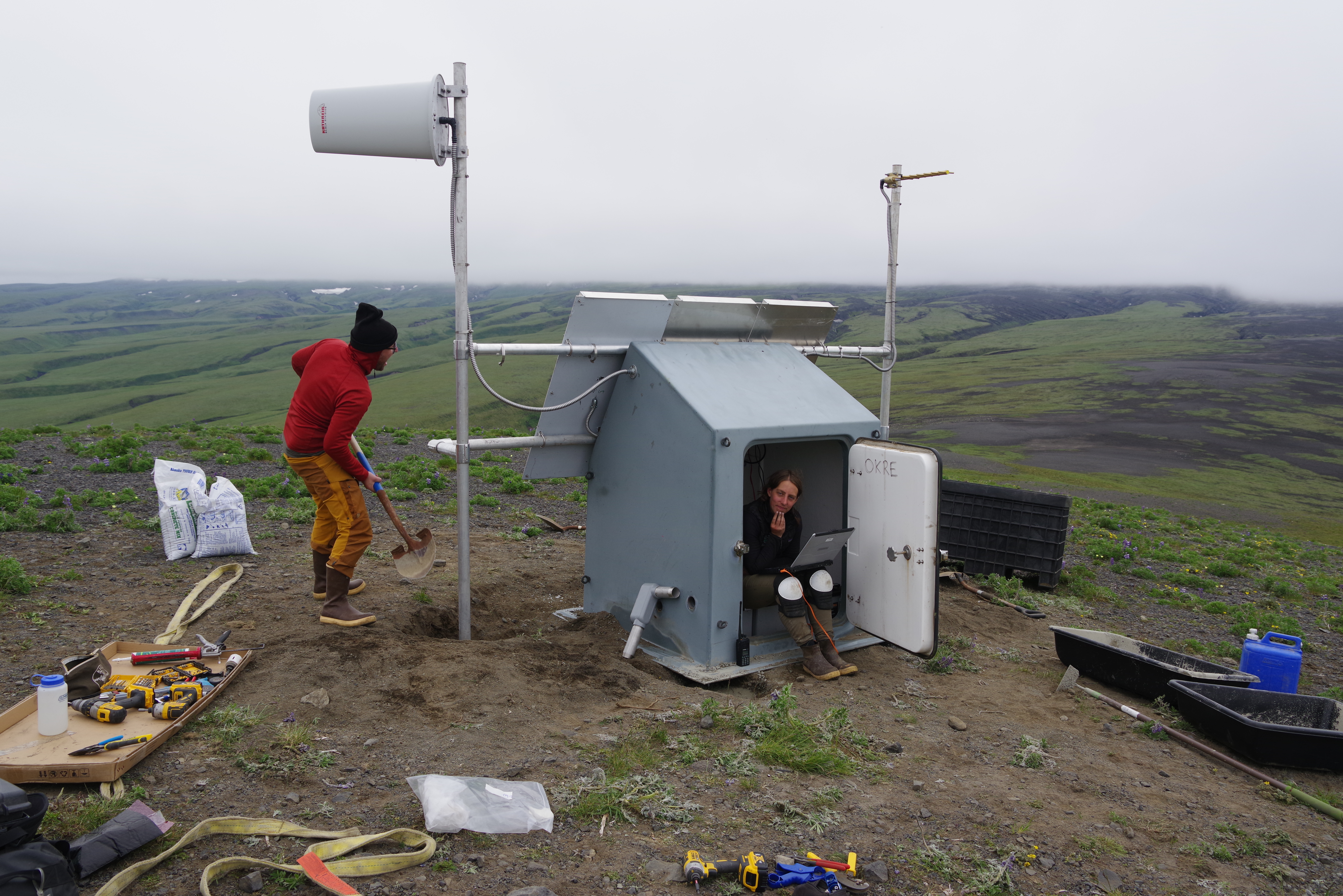 Upgrading AVO's monitoring network at Umnak Island during the 2021 A2D AVO campaign. Skye Kushner (UAF/GI) and Cora Siebert (DGGS) installing repeater site OKCK1, part of the Okmok digital network on Umnak Island.
