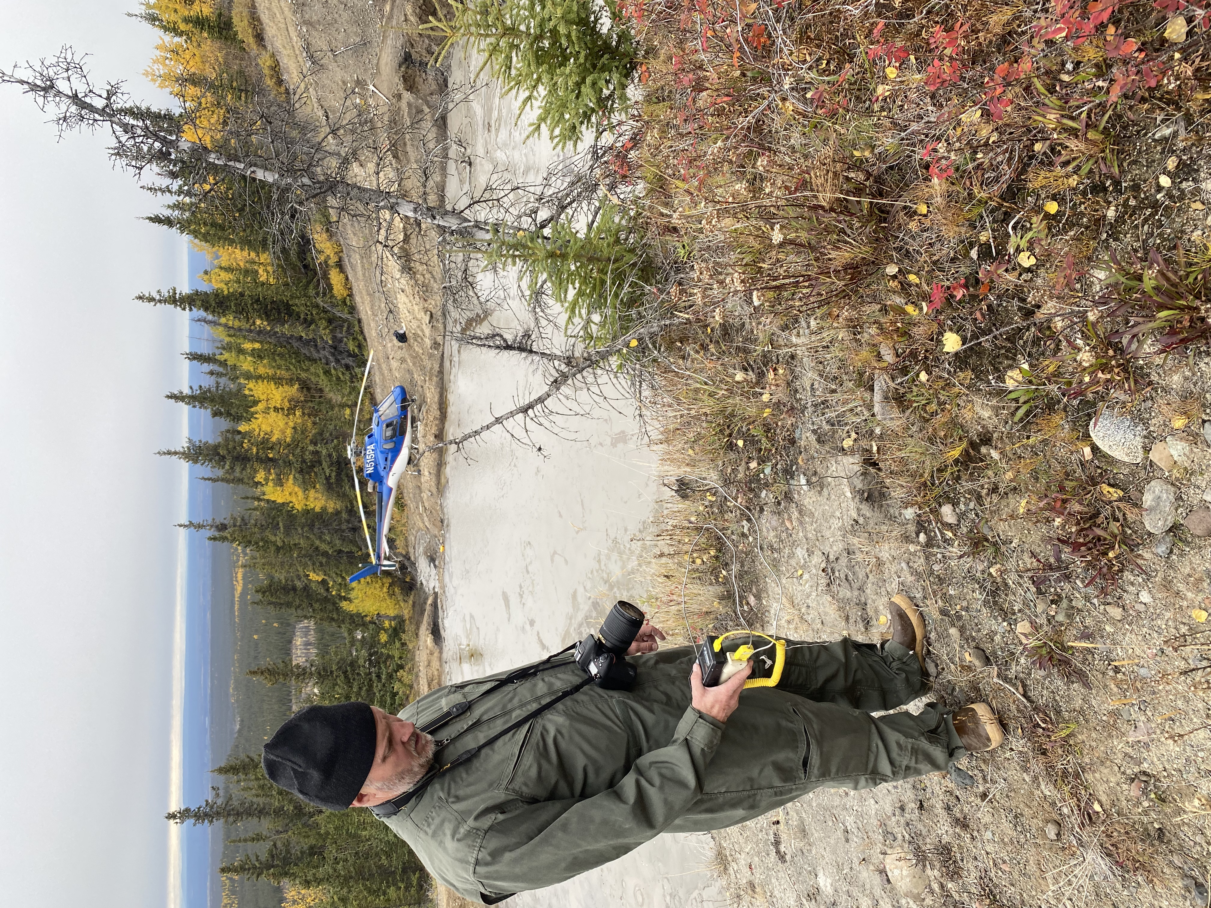 AVO geologist Tim Orr measuring temperature at a vent in the wall at the south end of the main pool at Shrub mud volcano. Temperature is 31.1°C.