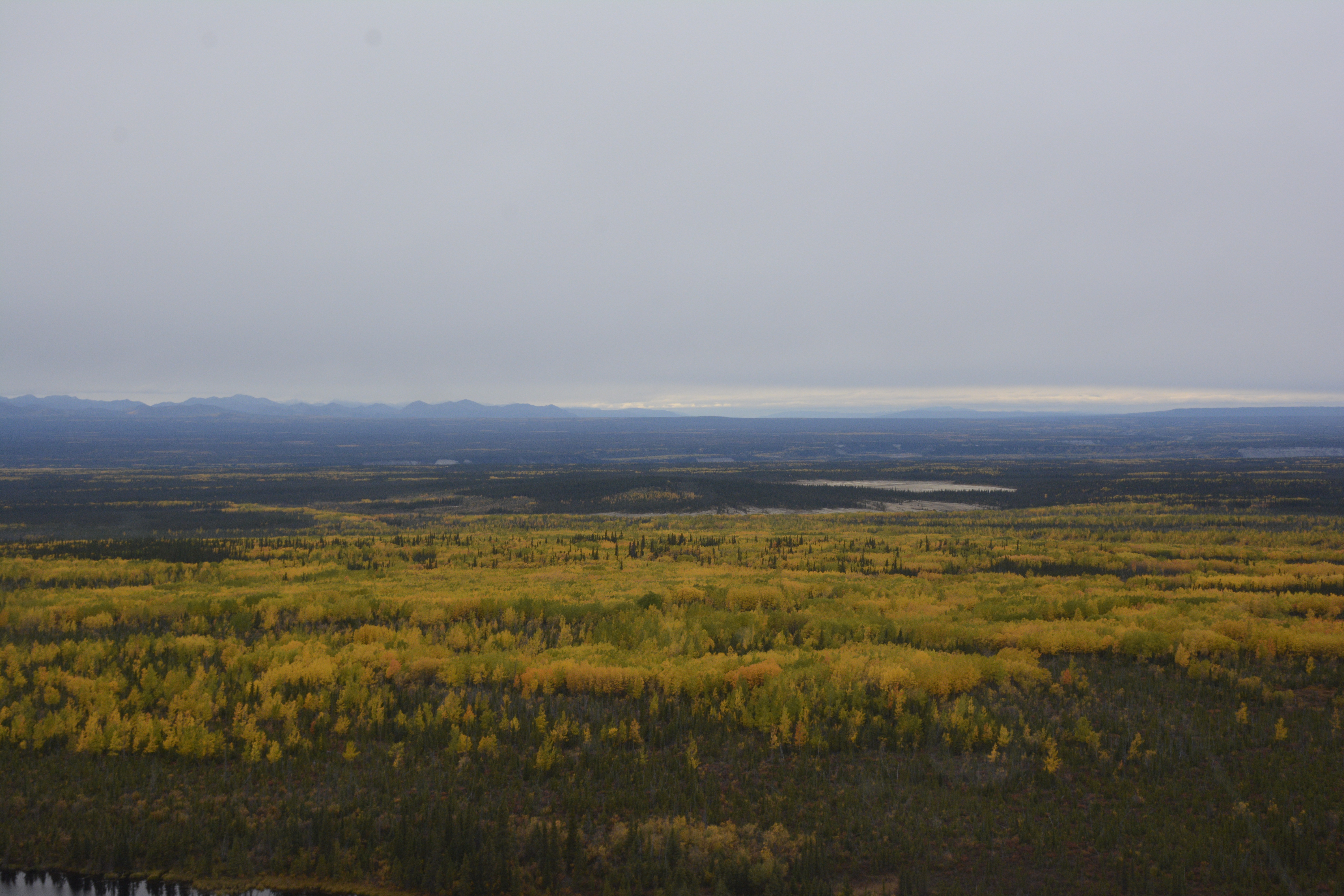 Oblique aerial view of Lower Klawasi mud volcano in the Copper River Basin west of Mt. Drum, in the Wrangell Mountains near Glennallen, AK. Lower Klawasi, barely evident at the center of the image, is low and broad and does not stand out in profile like Upper Klawasi and Shrub mud volcanoes.