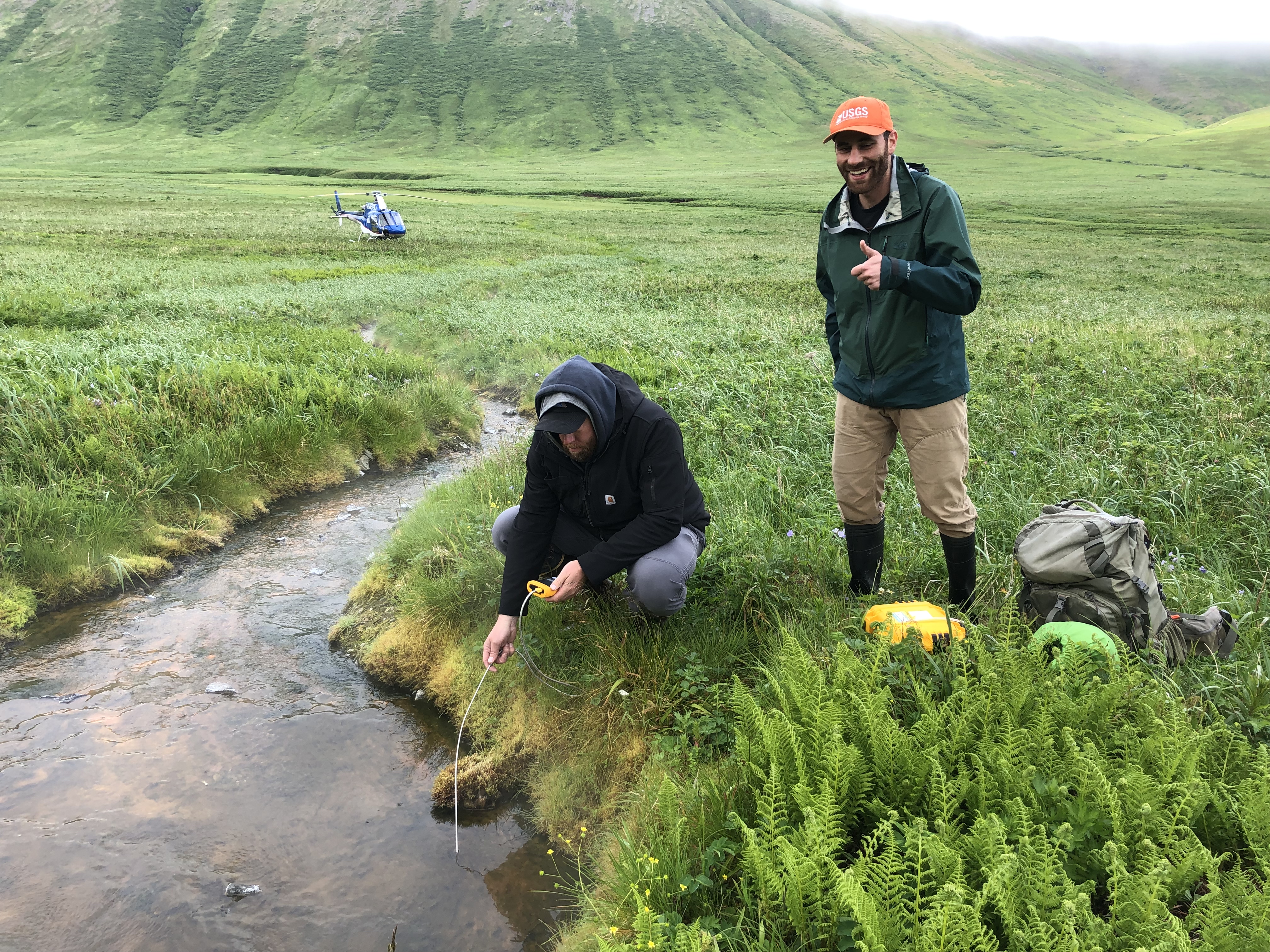 Allan Lerner (USGS-CVO) and Mike Grover (Pathfinder Aviation) check temperatures at False Pass hot springs, east of False Pass, in June 2021.