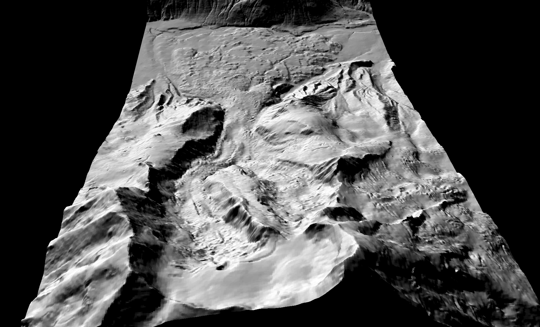 Computer-generated perspective view towards the north of part of Mount Redoubt in 1990. The piedmont lobe of the Drift Glacier is in the upper central part of the image. Gray shaded relief image of Digital Elevation Model (DEM) derived from detailed contours.