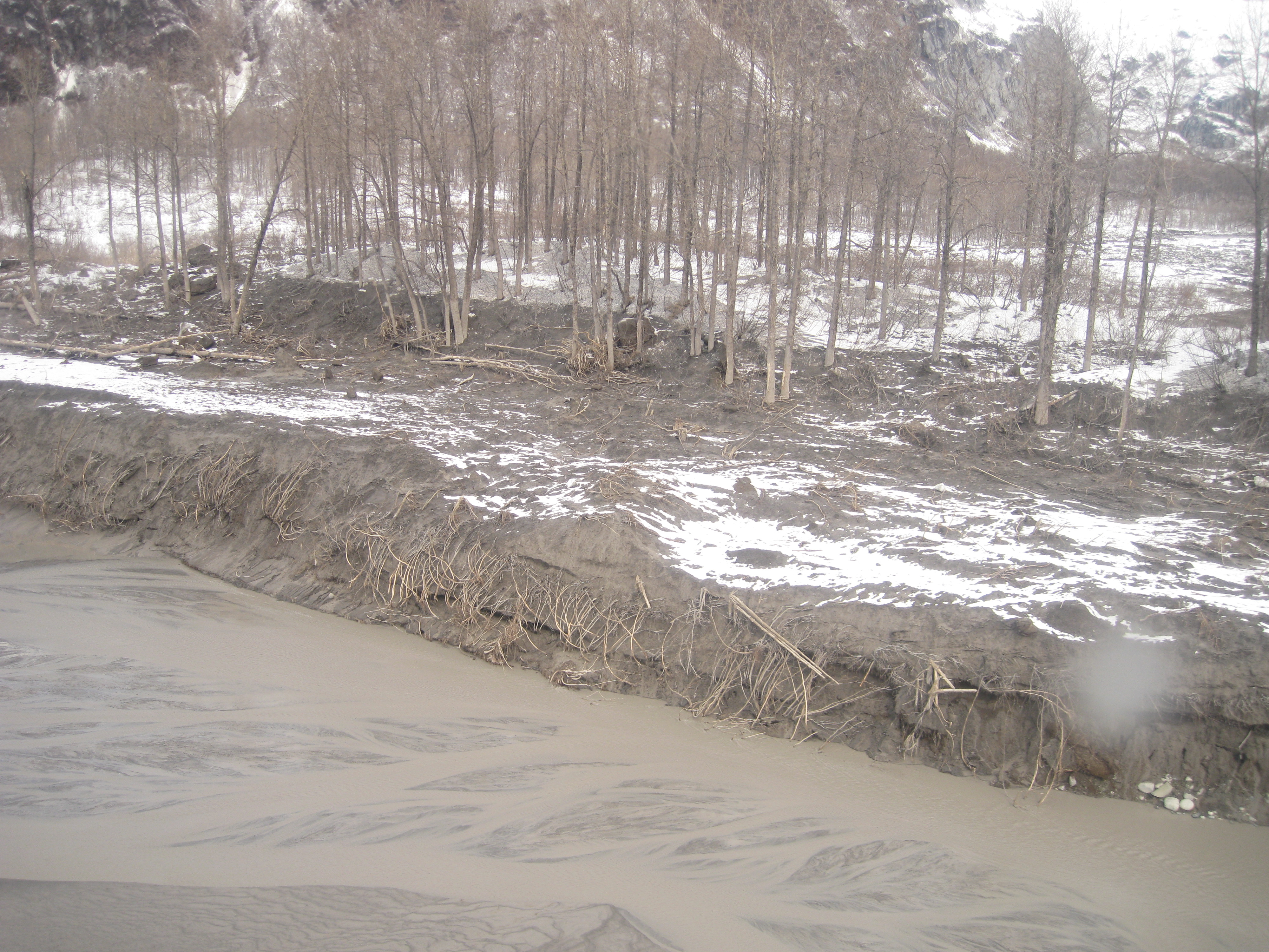 Lahar and flood deposits in the Drift River valley from the April 4, 2009 eruption of Redoubt Volcano. The location is on the north side of the valley where the Drift River lobe of Double Glacier enters the valley, about 14 km (8.7 mi) downstream from the terminus of the Drift glacier. The flow ran up onto, and through low points on the terminal moraine shown above. High water mark on the trees was 10 m (33 ft) above the active channel, though average flow depths were estimated to have been 2–5 m (6.6–16.4 ft) (Waythomas and others, in press). Photograph by Willie Scott, CVO/USGS, April 17, 2009.