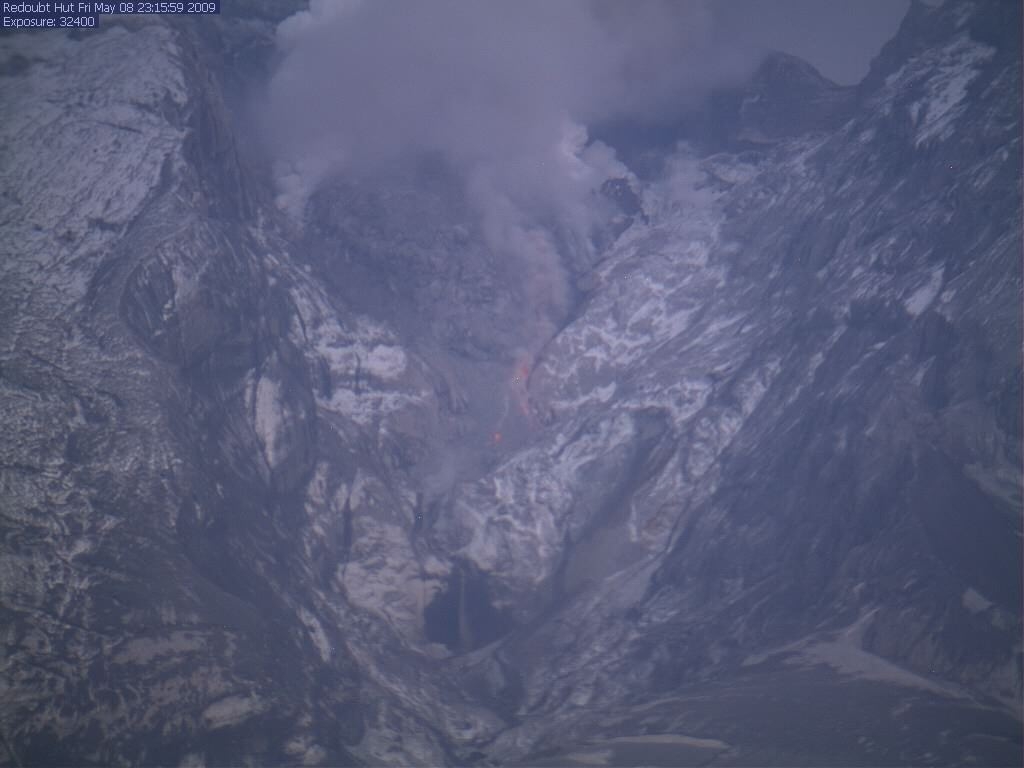 Incandescent rockfall on the Redoubt lava dome can be seen in this hutcam image from 5/8/09 at 11:15 pm.