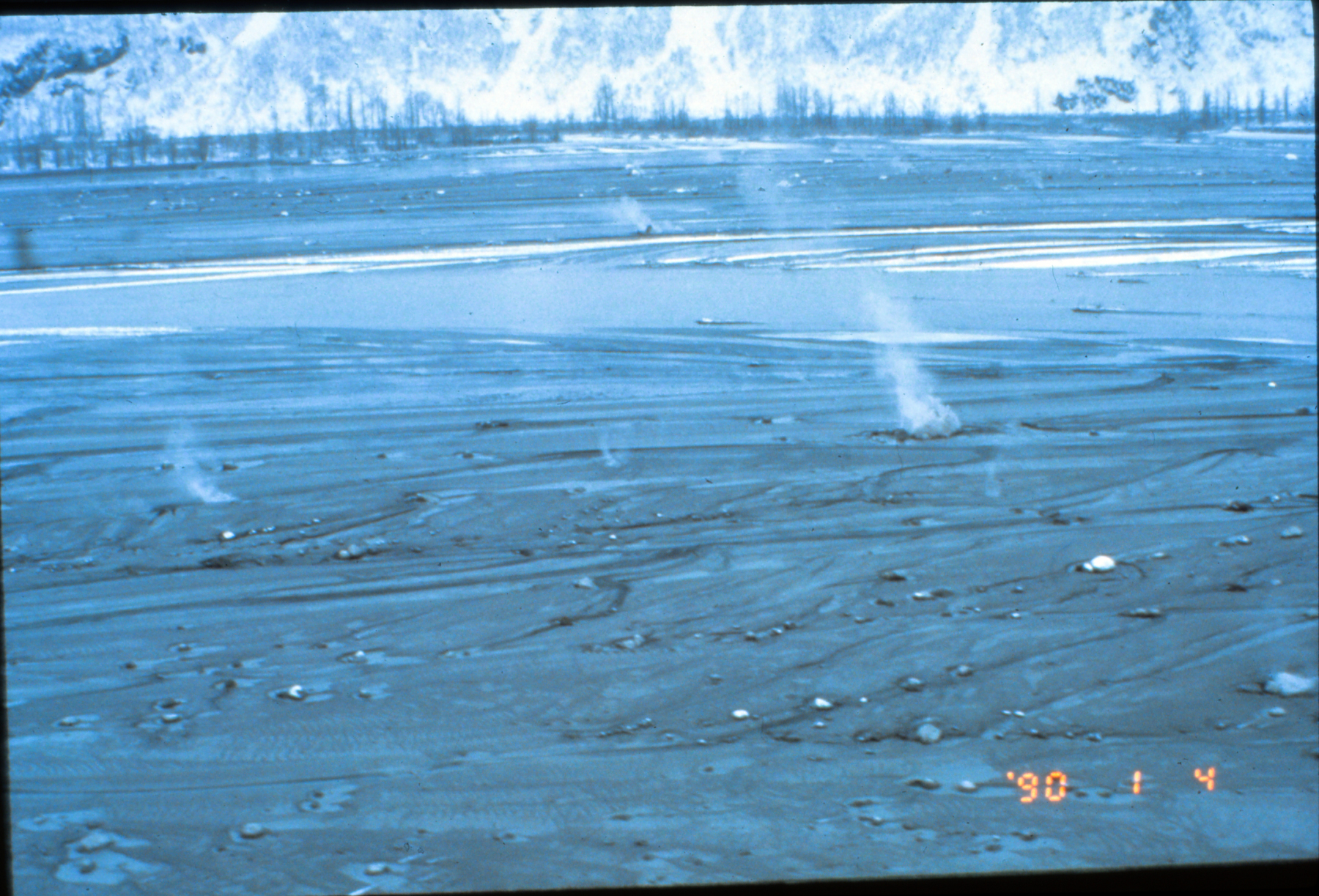 Hot, steaming blocks of the Redoubt dome that failed on January 2, 1990, strewn along the Drift River valley.