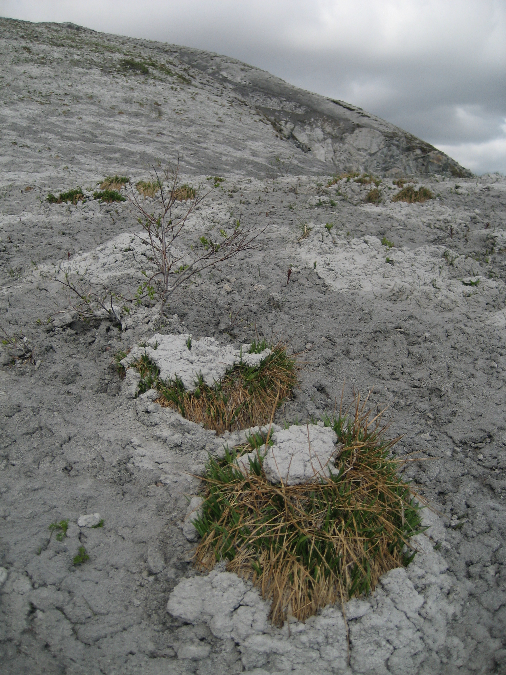 Grass tussocks seem to have an advantage over other low, creeping, tundra plants when it comes to surviving an eruption. Near the GPS site RNE, to the north of Redoubt volcano, two inches of ash and tephra cake the ground surface. Unless additional rainfall or snowmelt erodes the ash and exposes the tundra, many plants will not survive this kind of burial. Fireweed can be seen bursting through cracks in the ashcover in the background. ***AVO research technician Max Kaufman took these images during 3 days of campaign GPS work on and around Redoubt volcano: June 6,8,10 2009.
