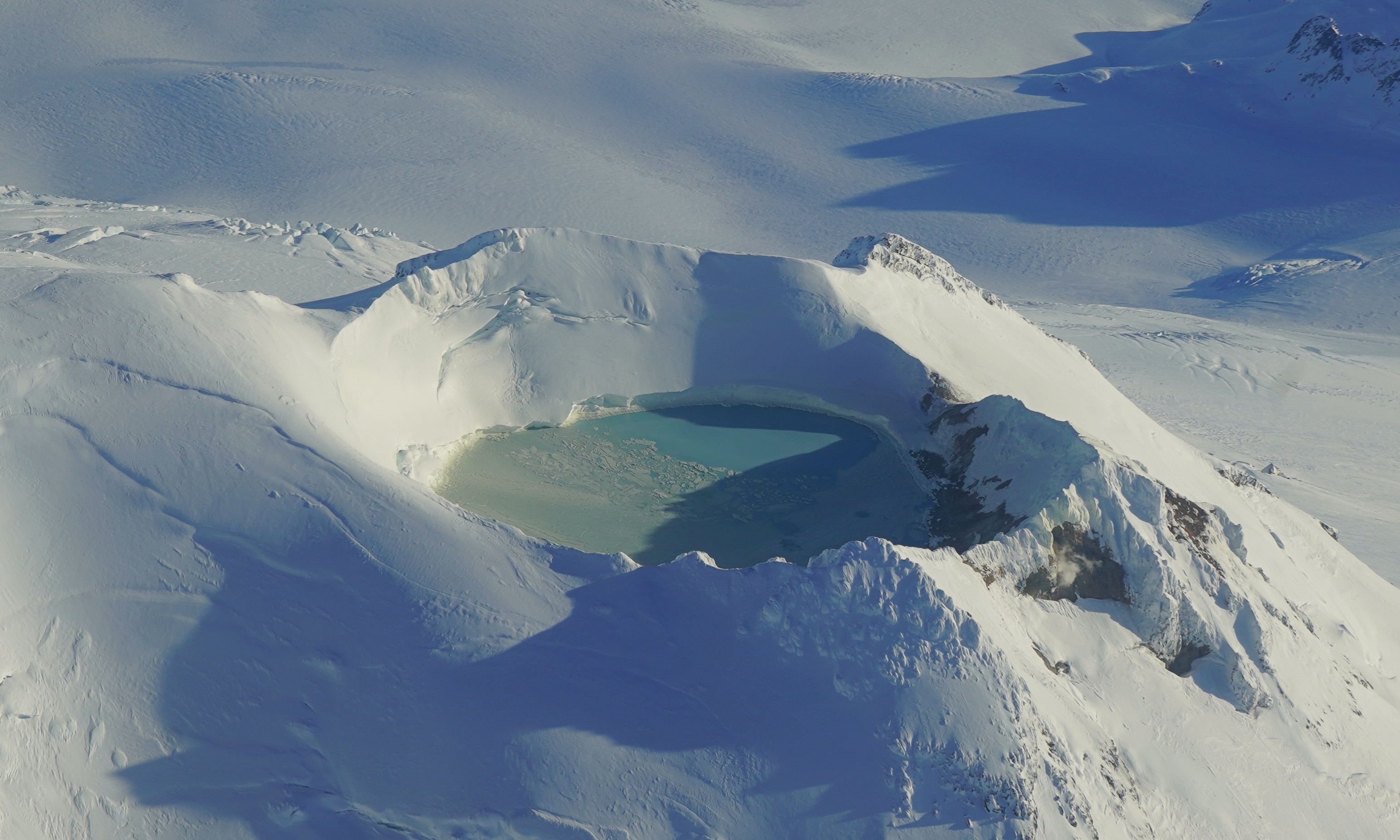 Aerial view of Douglas' summit crater. Ice can be seen rafting in a partially open lake surface and degassing from outer crater fumaroles can be seen in lower right of image.