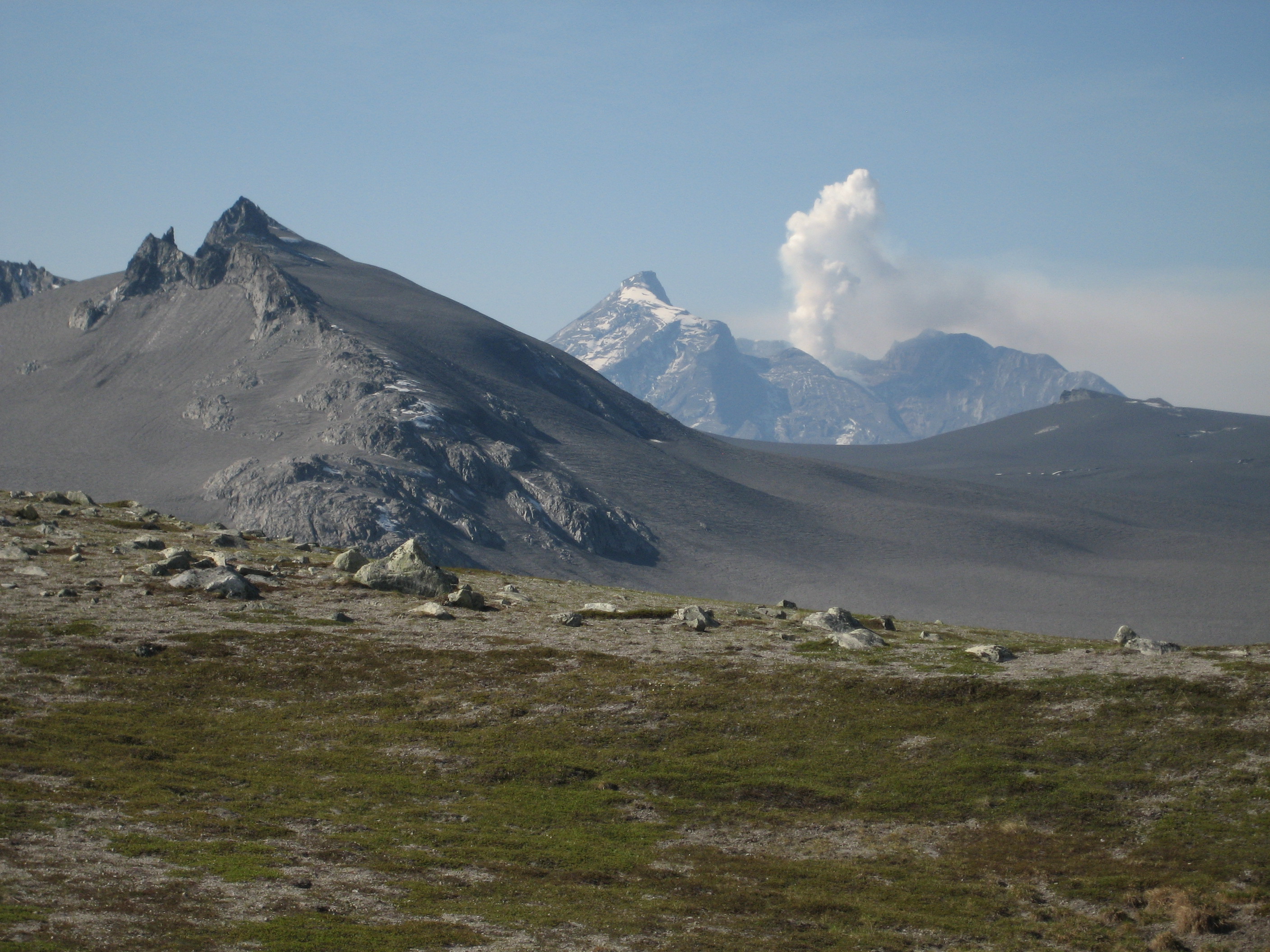 From the large nunatak in the Double Glacier, the top of Redoubt volcano looms to the SSW, beyond the glacier's ash blanketed, southern nevees. **AVO research technician Max Kaufman took these images during 3 days of campaign GPS work on and around Redoubt volcano: June 6,8,10 2009.