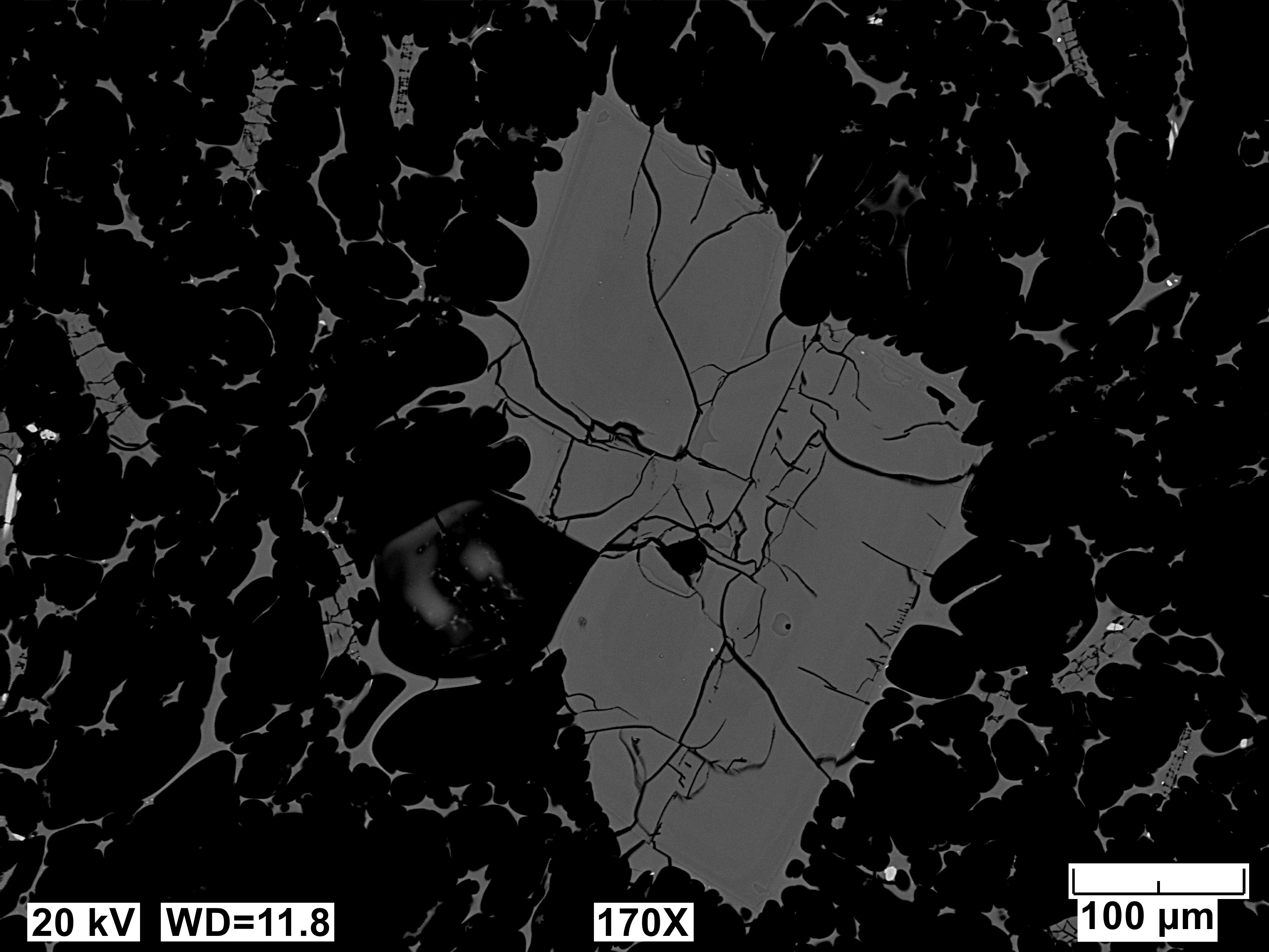 Backscatter electron polished mount image of an Edgecumbe rhyolite pumice (sample 82ARJ136). Image acquired on an JEOL 6510LV SEM at 20 kV, 12 mm working distance, spot size of 65, and in BEC imaging mode.