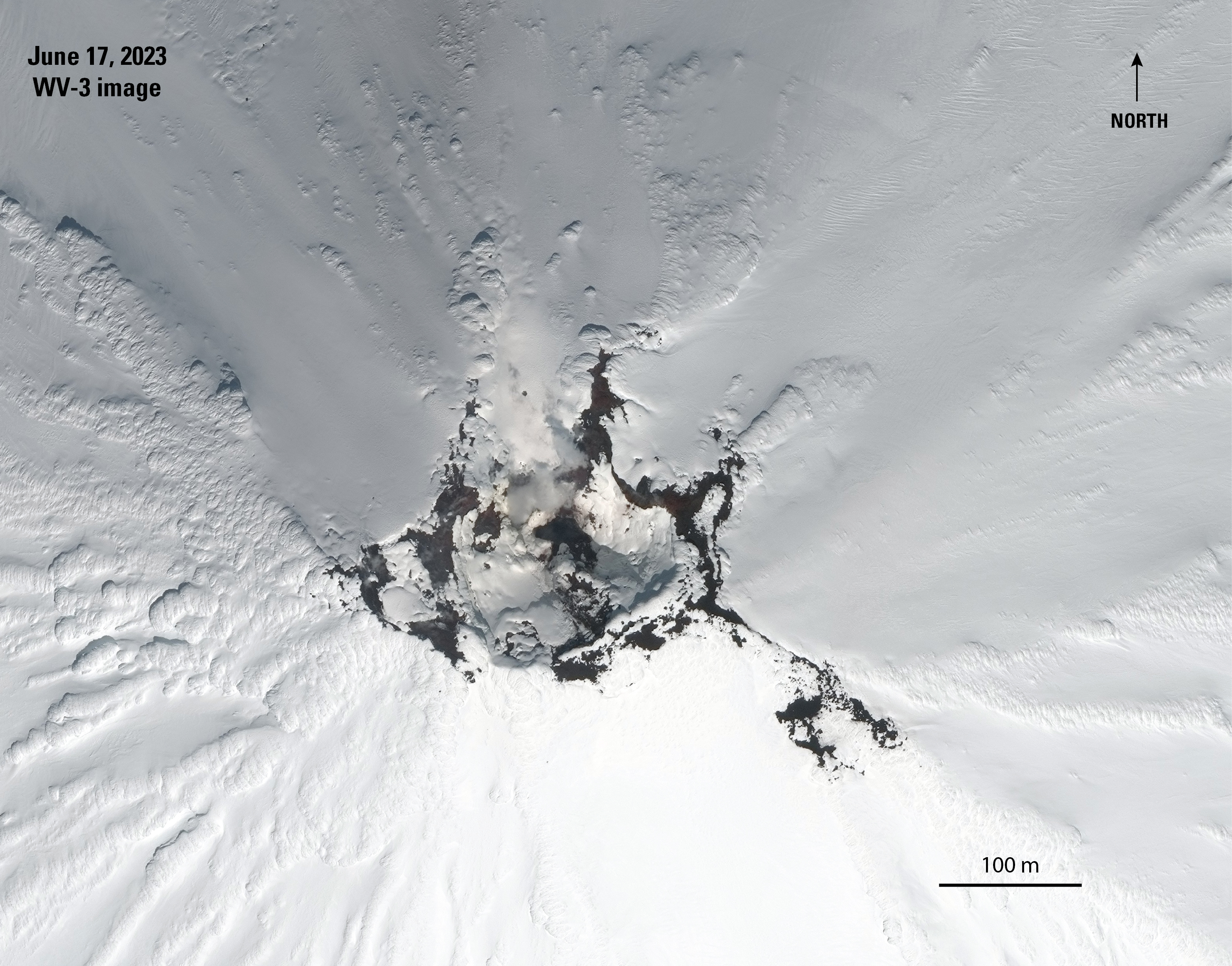 WorldView-3 image of the Shishaldin summit crater, June 17, 2023. Image use courtesy of USGS NextView License.