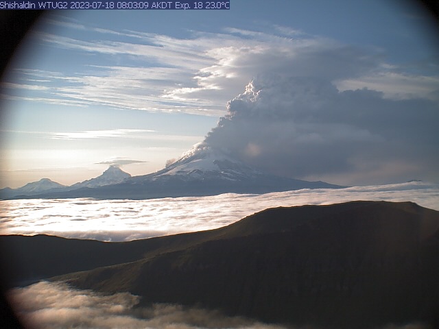 Shishaldin Volcano eruption plume, captured in 8:03 am July 18 2023 (local time, AKDT) webcam image. WTUG is northwest of Shishaldin.