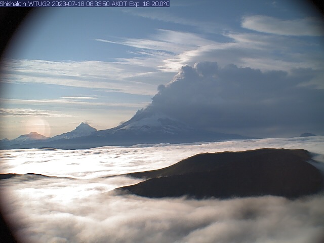 Shishaldin Volcano in eruption, July 18, 2023. Image captured by AVO's WTUG webcam, to the northwest of Shishaldin.
