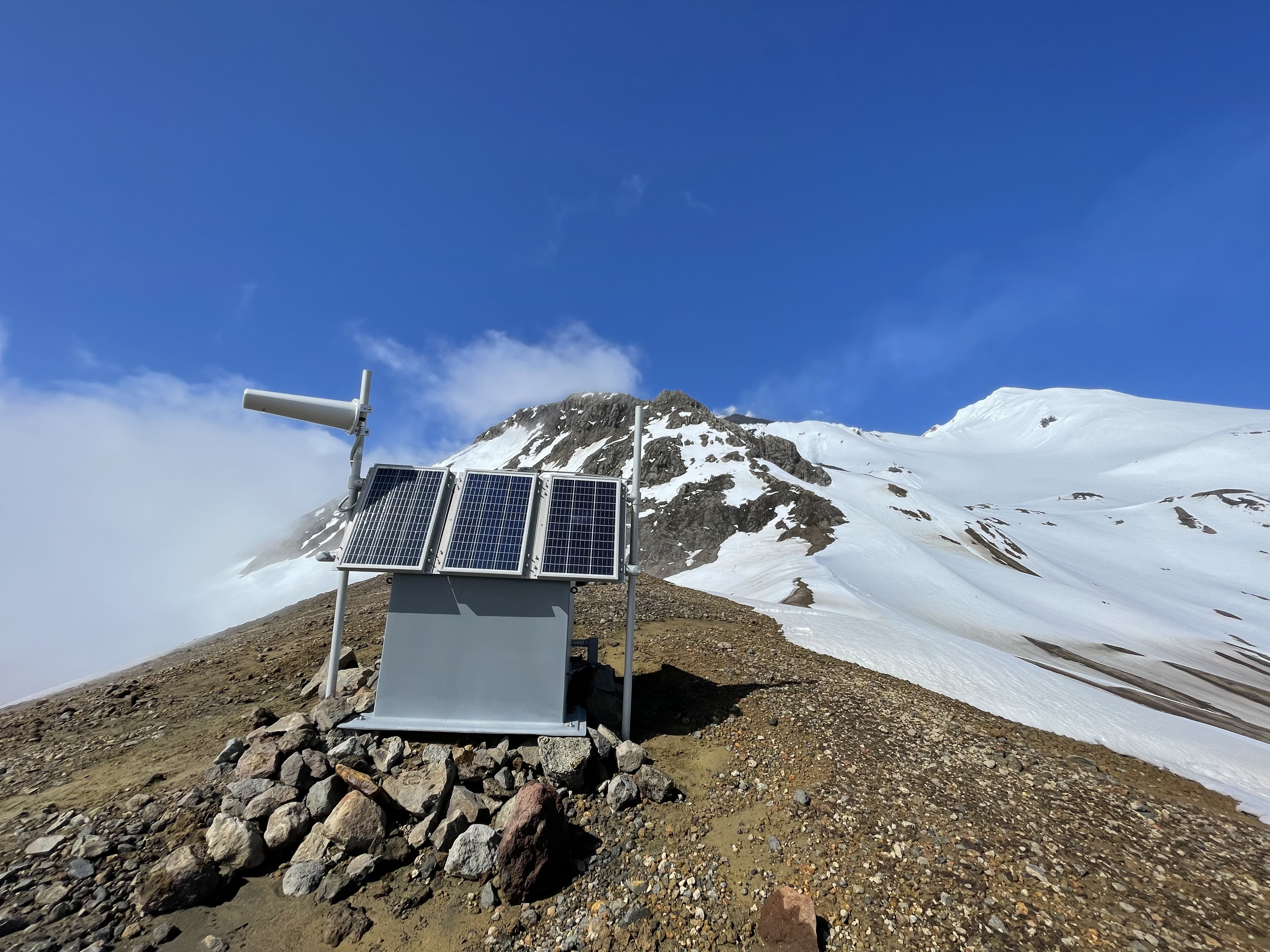 AVO field staff repairing site GSTD on Great Sitkin Volcano. The new lava dome is just peeking out on the skyline.