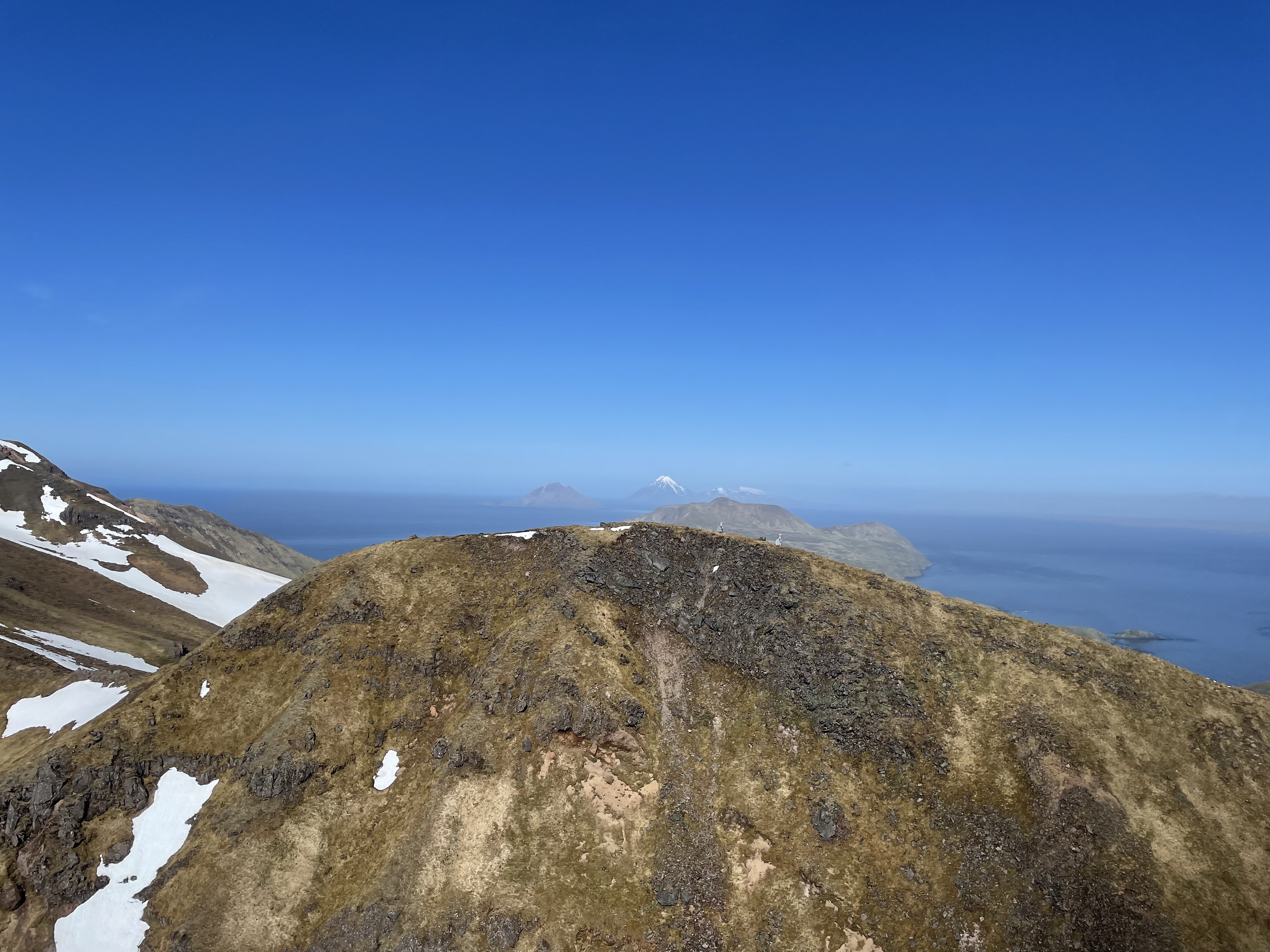 A very rare clear view of the ridge at seismic/repeater site TAPA, Tanaga Island, western Aleutians. Bobrof and Kanaga Volcanoes are visible in the distance.