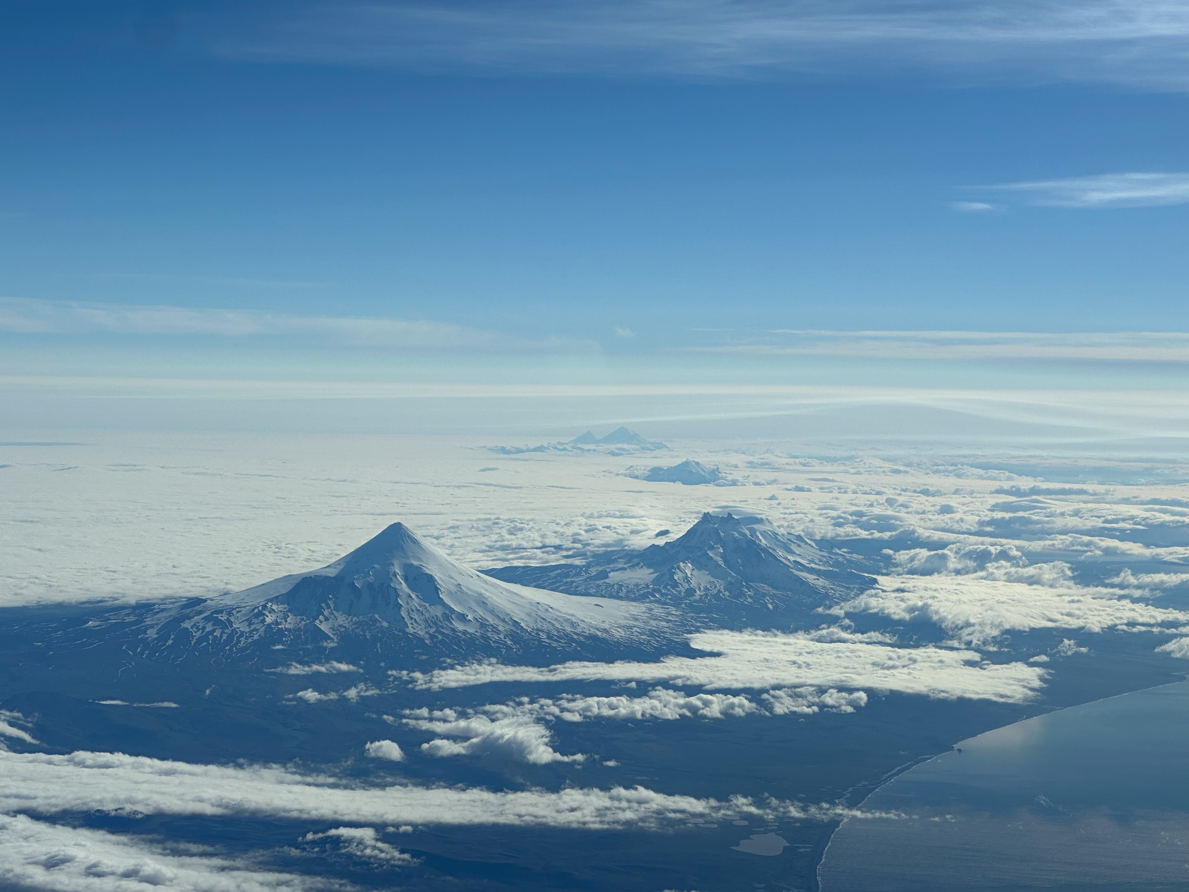 From front to back: Shishaldin Volcano, Isanotski, Roundtop, Frosty, and Pavlof/Pavlof Sister volcanoes. Photo taken from the air, July 11, 2023.