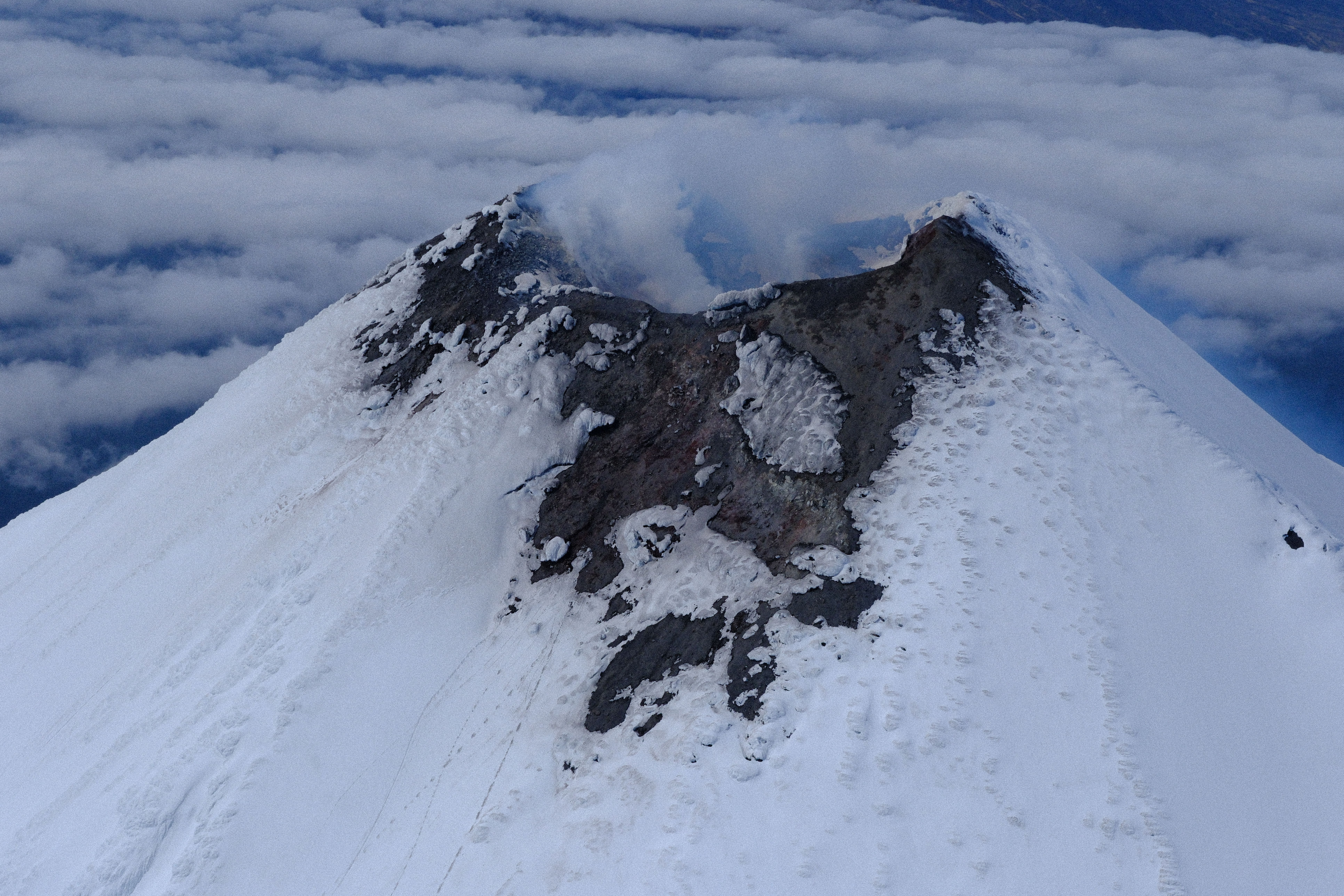 View of the summit of Cleveland Volcano from a helicopter, showing degassing and steaming.