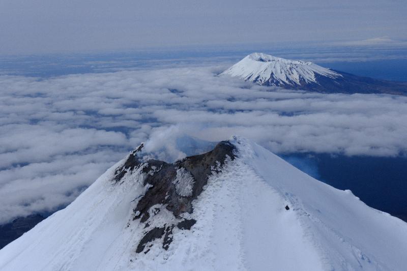 The summit of Cleveland Volcano on June 1, 2023, showing steaming and degassing at the summit crater. Herbert Island and cloud-covered Yunaska Island are visible in the background.