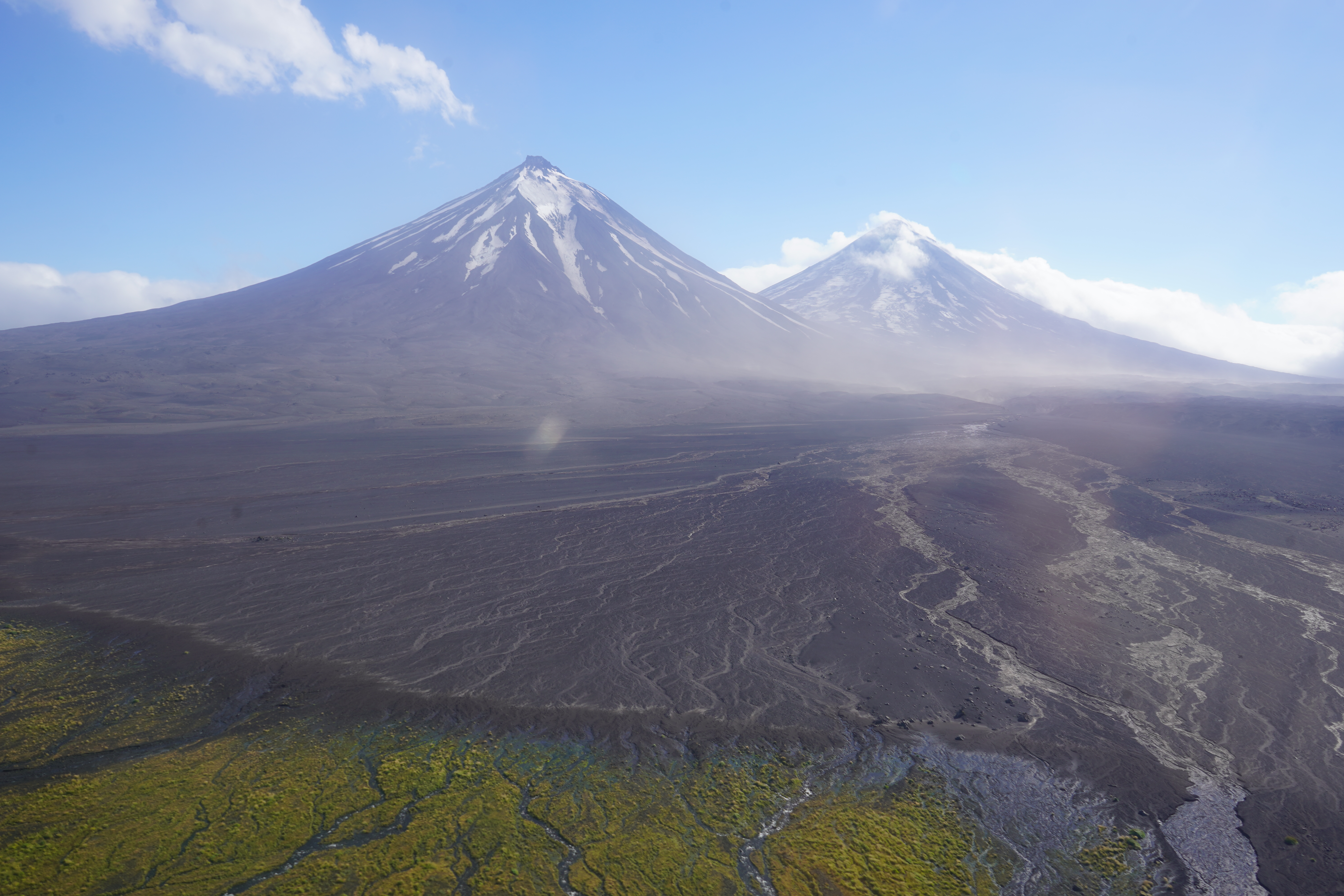 Resuspended ash on the north flanks of Pavlof Sister (left) and Pavlof Volcano (center).