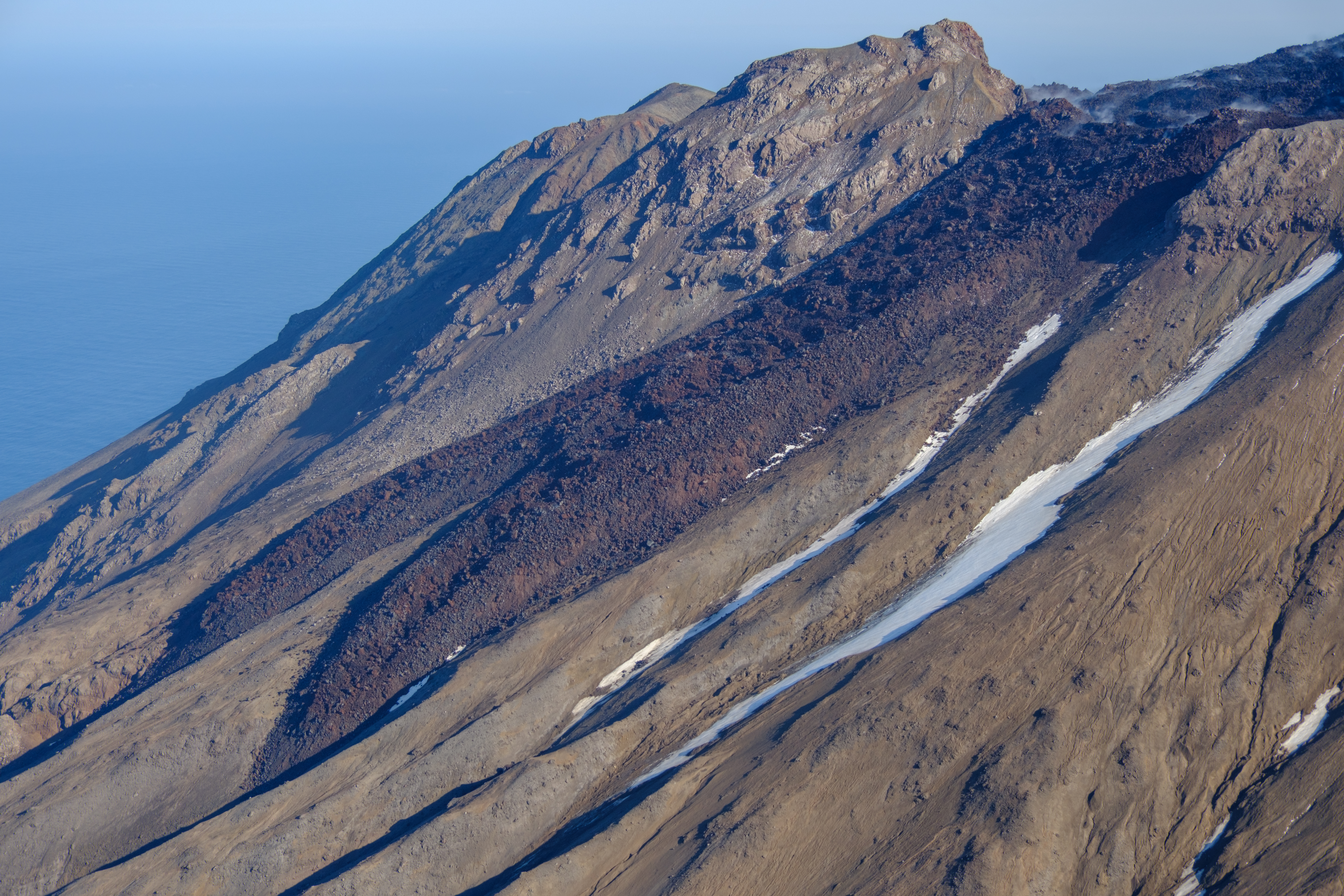 Oblique view of Great Sitkin Volcano looking north at lava flows from the crater taken on September 1, 2023 during a helicopter overflight by AVO geologists.