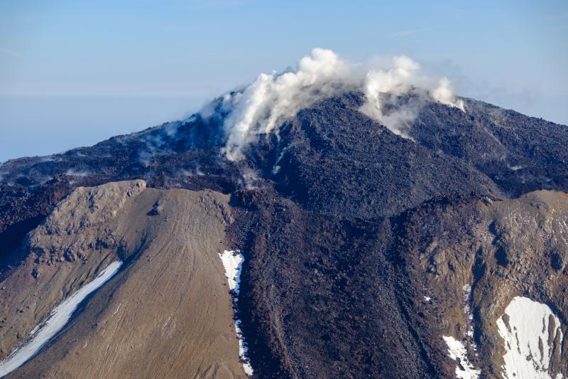 Oblique view of Great Sitkin Volcano looking northeast the active lava flows from the crater taken on September 1, 2023 during a helicopter overflight by AVO geologists.
