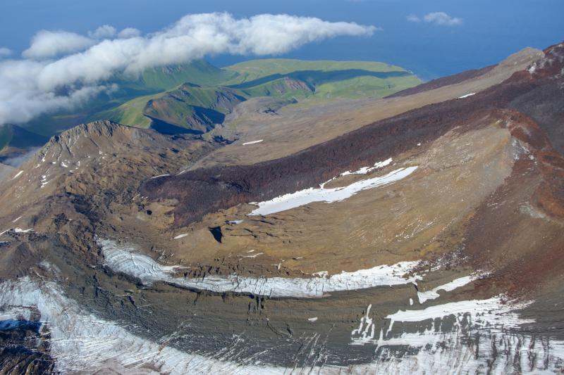 Oblique view looking northwest at the southwest flank of Great Sitkin Volcano taken on September 1, 2023 during a helicopter overflight by AVO geologists. A gray lahar deposit from May 2021 is visible at the bottom of the photo while a lava flow that siplledout of the crater in 2021 and 2022 is visible in the middle of the crater.